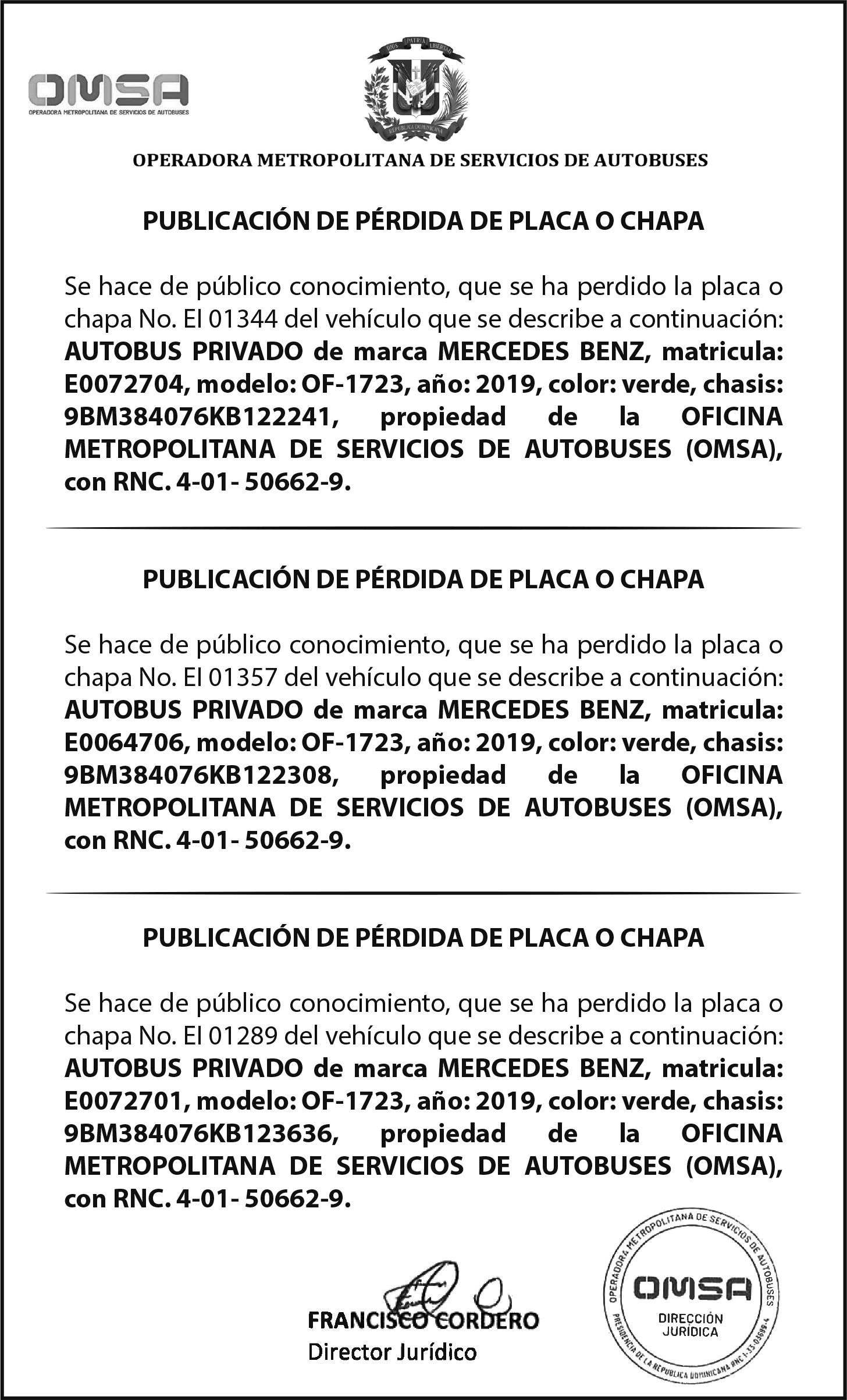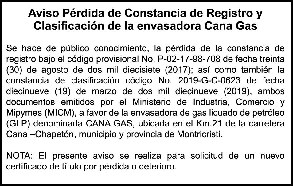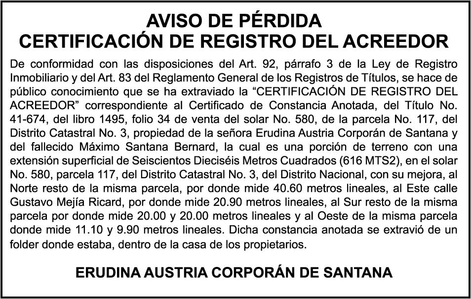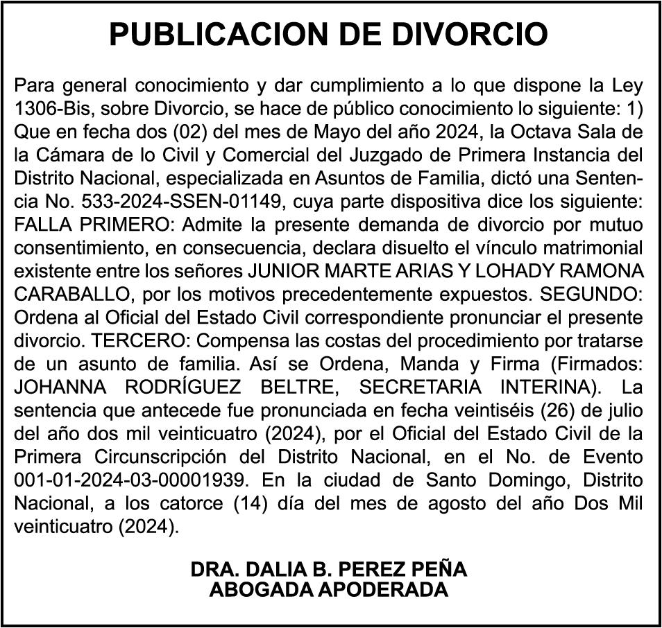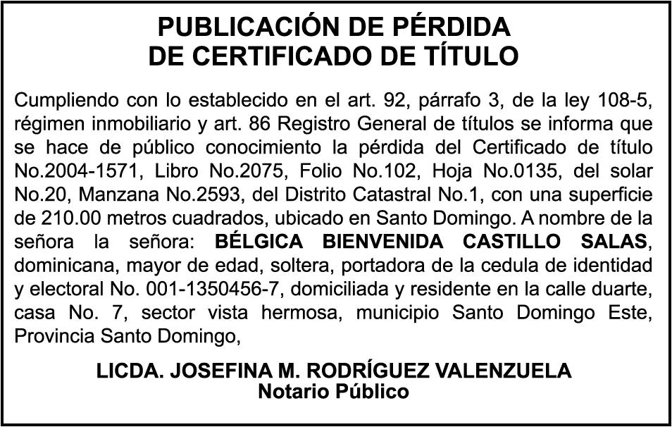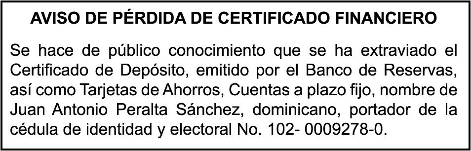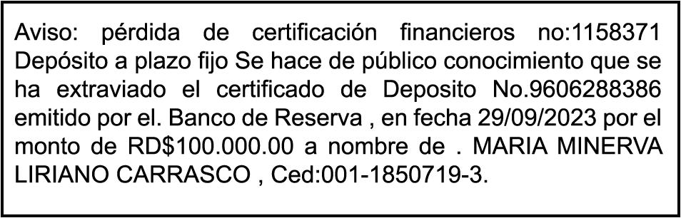 PERDIDA DE MATRICULA, AUTOMOVIL PRIVADO Volkswagen, Placa A175775, Modelo Jetta, Color blanco, Año 2001, Chasis, 3VWSH29M31M115481, a Nombre de KATERYNE ADELIS JUMA GUTIERREZ. SE hace de público conocimiento la pérdida del Certificado Financiero número 841168636 emitido por Banco Popular Dominicano, S. A., a favor ROSA ANYELIS RODRIGUEZ REYNOSO, Portadora de Cedula de Identidad y Electoral no. 402-1391323-5 y MARCIA ANYELINA REYNOSO CASTILLO portadora de la Cedula de Identidad y Electoral numero 0370069493-2, certificado expedido en fecha 6 de mayo de 2024 por el Monto (RD$30,800.51).
