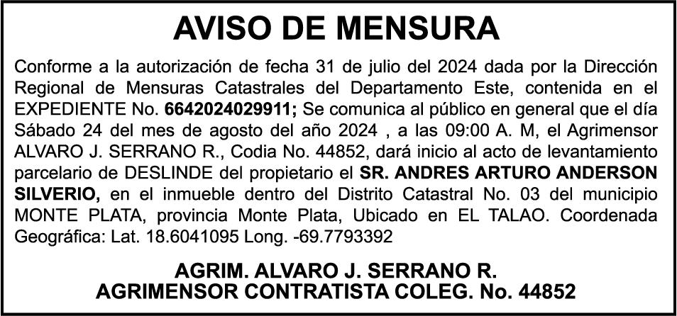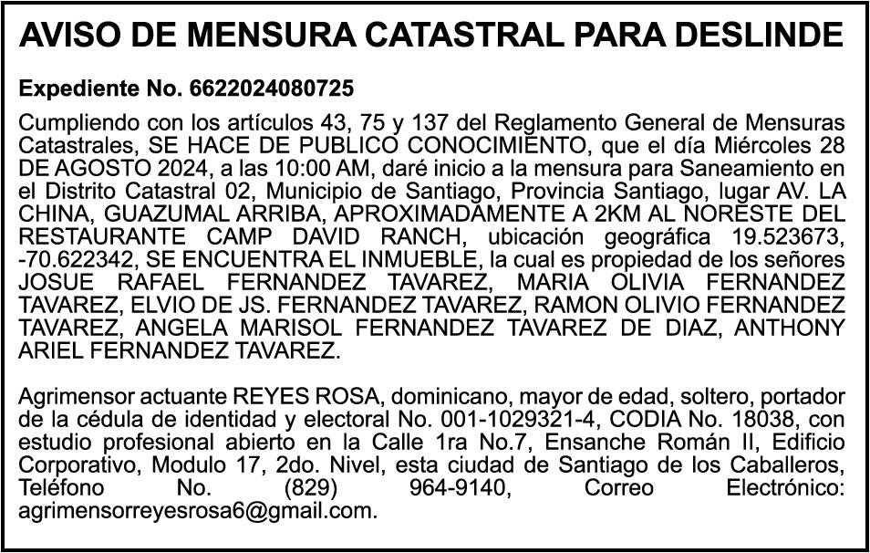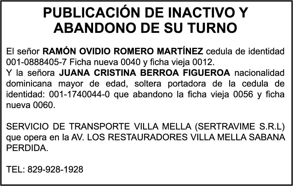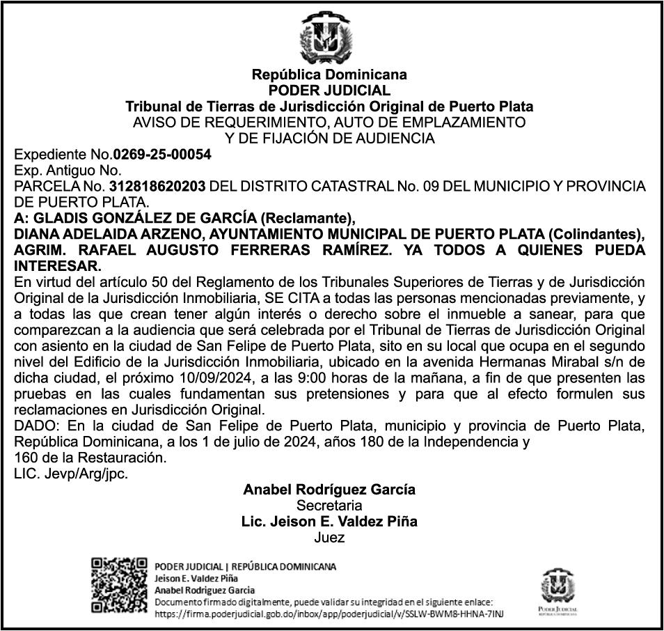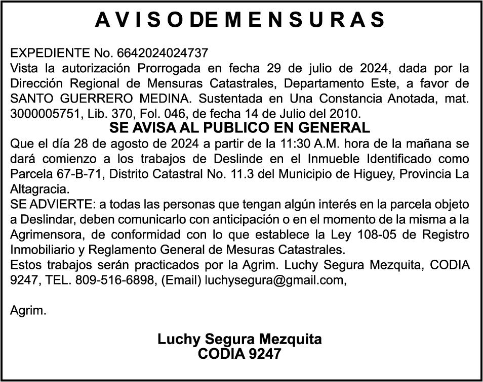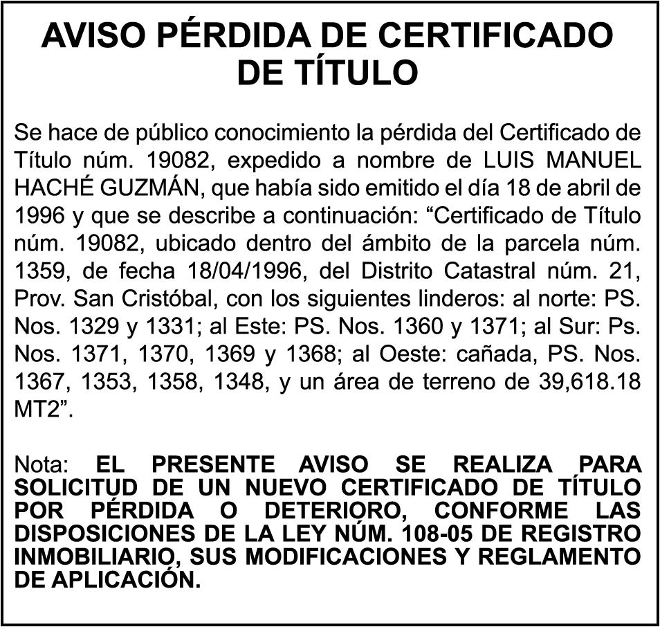 PERDIDA DE MATRICULA, AUTOMOVIL PRIVADO Volkswagen, Placa A175775, Modelo Jetta, Color blanco, Año 2001, Chasis, 3VWSH29M31M115481, a Nombre de KATERYNE ADELIS JUMA GUTIERREZ. SE hace de público conocimiento la pérdida del Certificado Financiero número 841168636 emitido por Banco Popular Dominicano, S. A., a favor ROSA ANYELIS RODRIGUEZ REYNOSO, Portadora de Cedula de Identidad y Electoral no. 402-1391323-5 y MARCIA ANYELINA REYNOSO CASTILLO portadora de la Cedula de Identidad y Electoral numero 0370069493-2, certificado expedido en fecha 6 de mayo de 2024 por el Monto (RD$30,800.51).