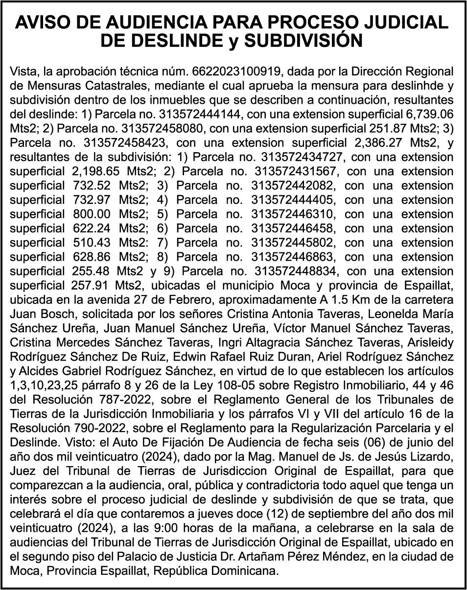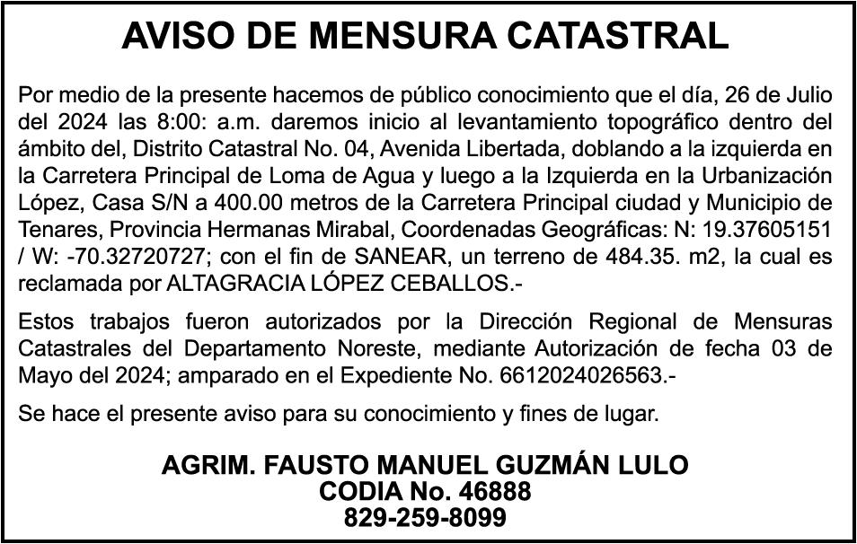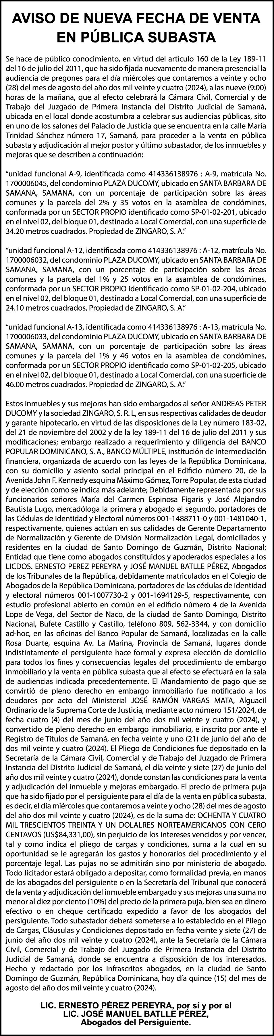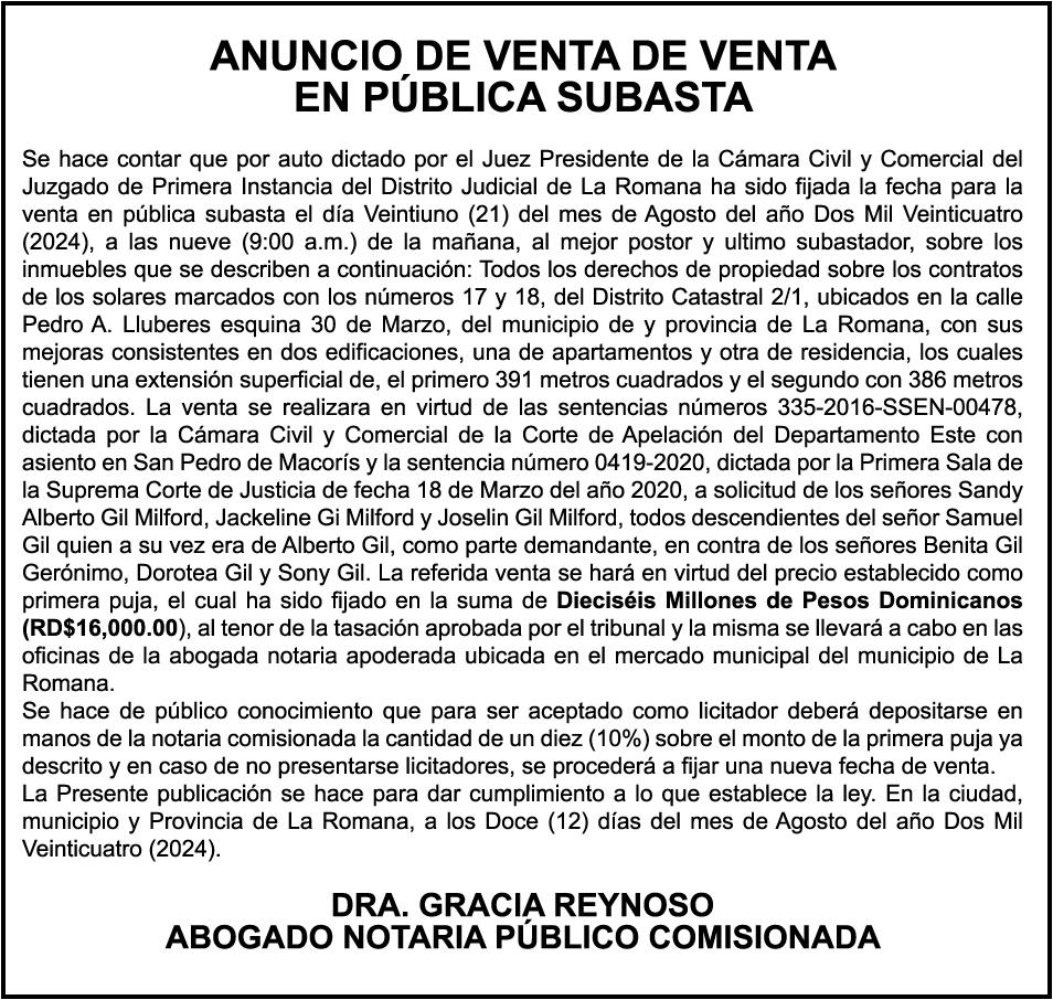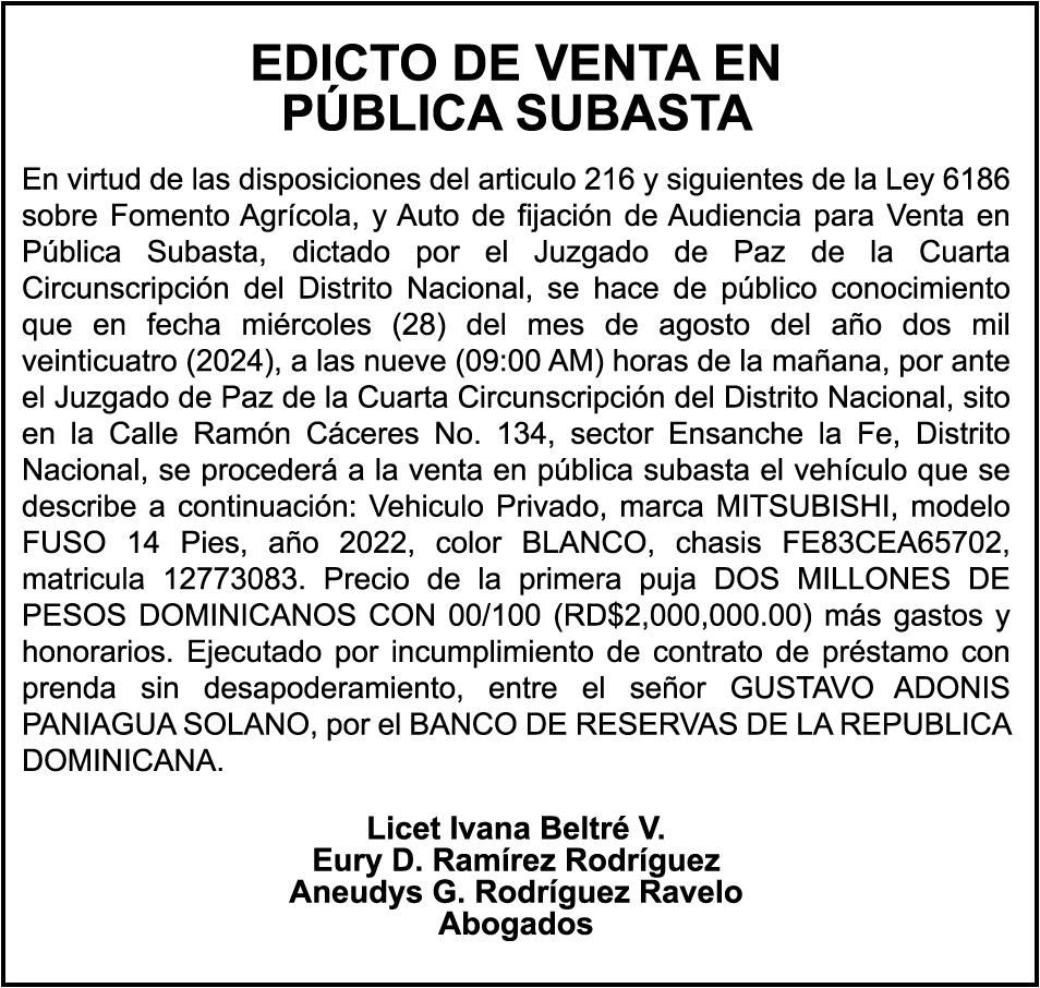 PERDIDA DE MATRICULA, AUTOMOVIL PRIVADO Volkswagen, Placa A175775, Modelo Jetta, Color blanco, Año 2001, Chasis, 3VWSH29M31M115481, a Nombre de KATERYNE ADELIS JUMA GUTIERREZ. SE hace de público conocimiento la pérdida del Certificado Financiero número 841168636 emitido por Banco Popular Dominicano, S. A., a favor ROSA ANYELIS RODRIGUEZ REYNOSO, Portadora de Cedula de Identidad y Electoral no. 402-1391323-5 y MARCIA ANYELINA REYNOSO CASTILLO portadora de la Cedula de Identidad y Electoral numero 0370069493-2, certificado expedido en fecha 6 de mayo de 2024 por el Monto (RD$30,800.51).