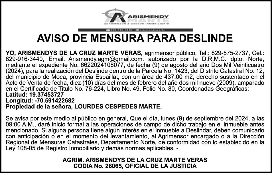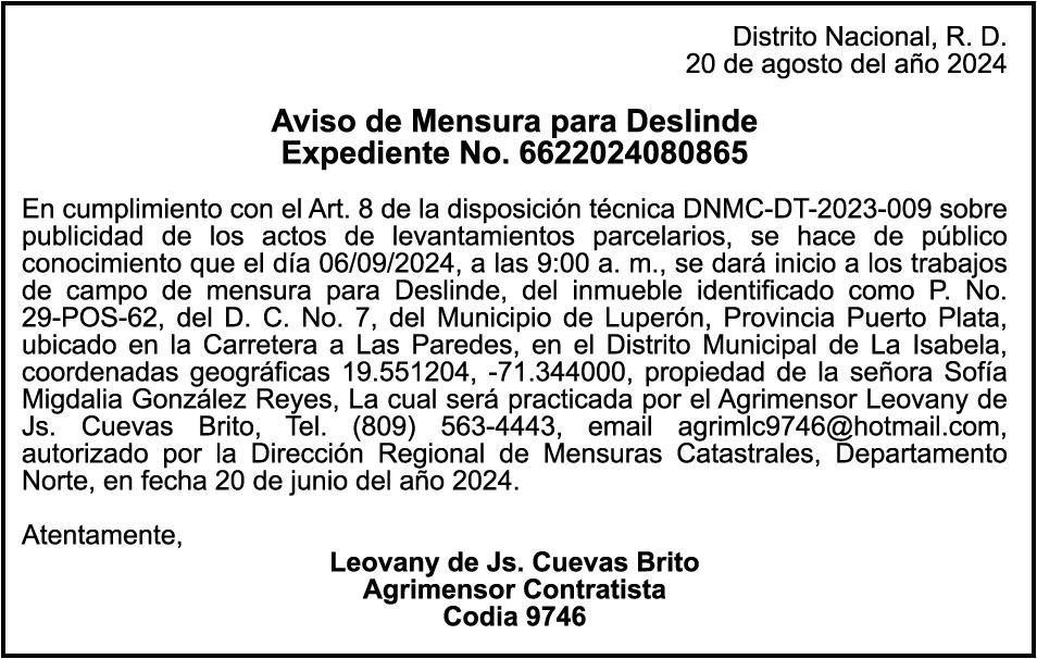 SE hace de público conocimiento la pérdida del Certificado Financiero número 839404068 emitido por Banco Popular Dominicano, S. A., a favor BRIGIDA MERCEDES DOMINGUEZ LUCIANO, Portadora de Cedula de Identidad y Electoral no. 001-1359498-0, certificado expedido en fecha 19 de febrero de 2024 por el Monto (RD$620,627.89), mas intereses generados a la fecha.