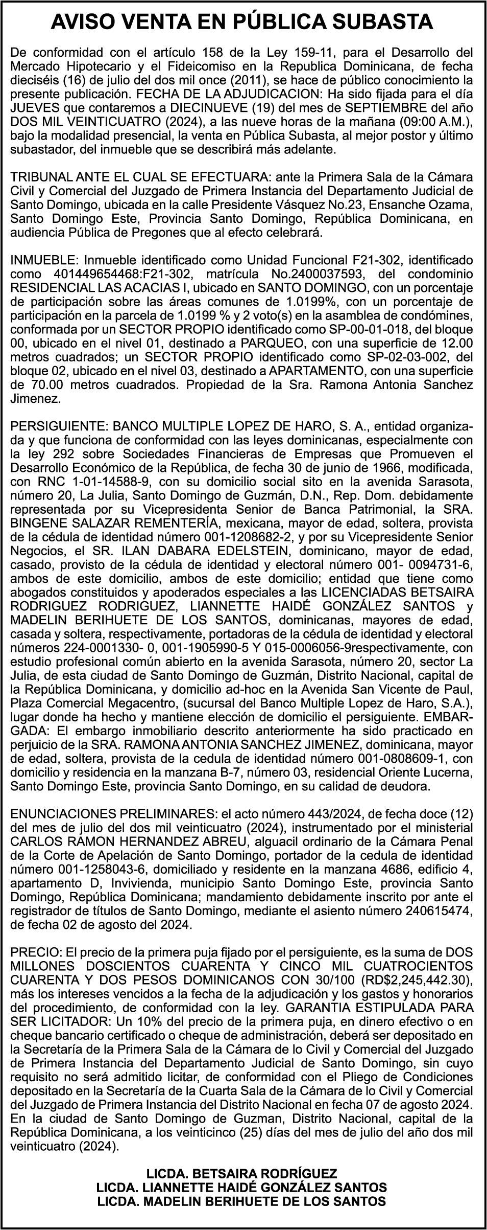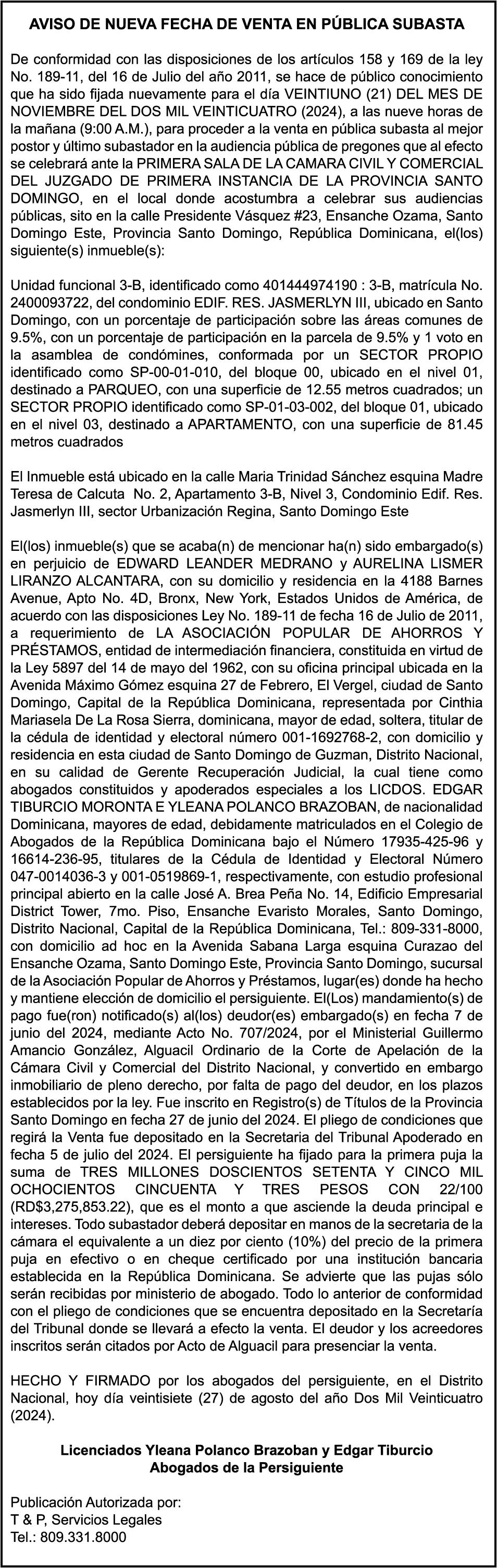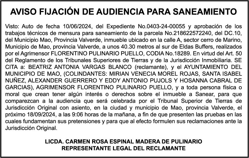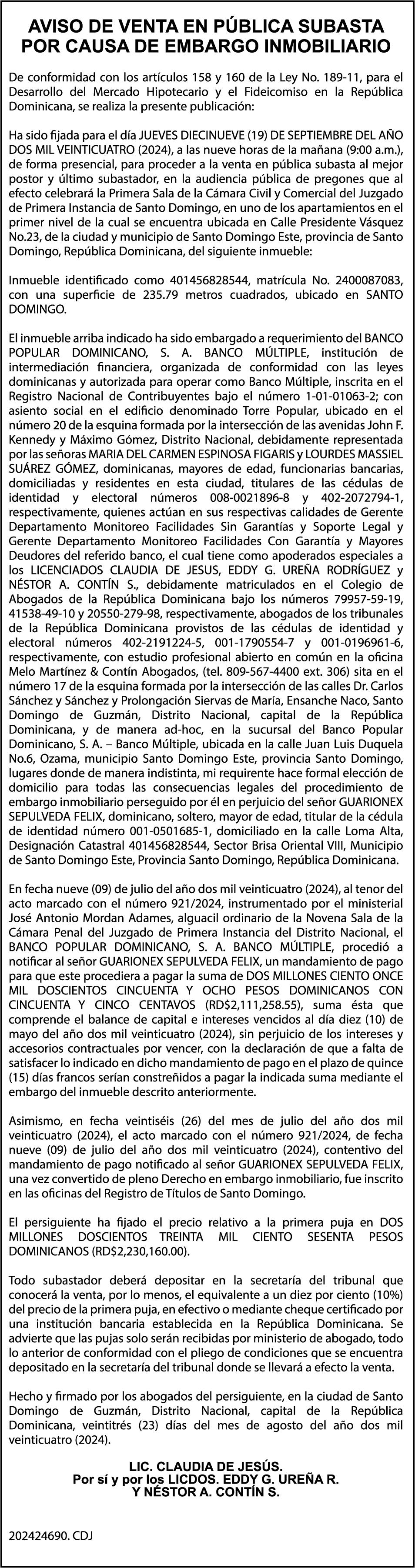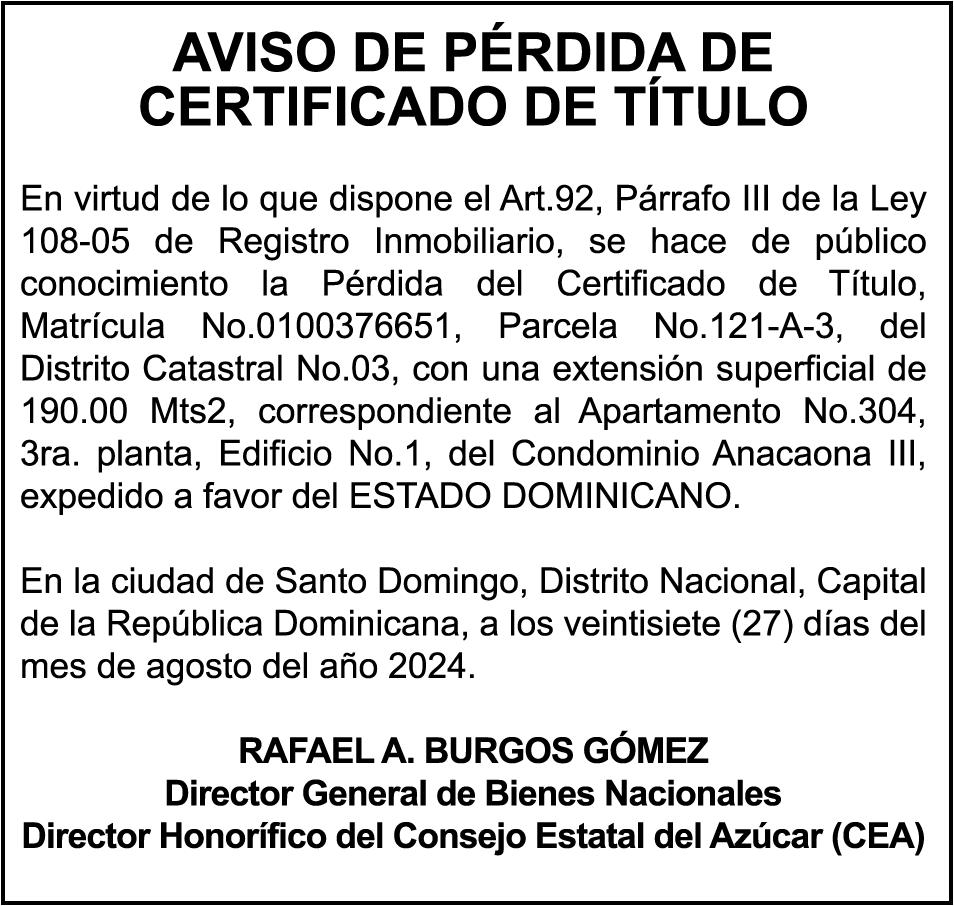 SE hace de público conocimiento la pérdida del Certificado Financiero número 794976126 emitido por Banco Popular Dominicano, S. A., a favor YULY YOKASTA DORSINE MONEGRO, portadora de Cedula de Identidad y Electoral número 0260132045-6, certificado expedido en fecha 20 de enero de 2016 por el monto (RD$65,000.00).
