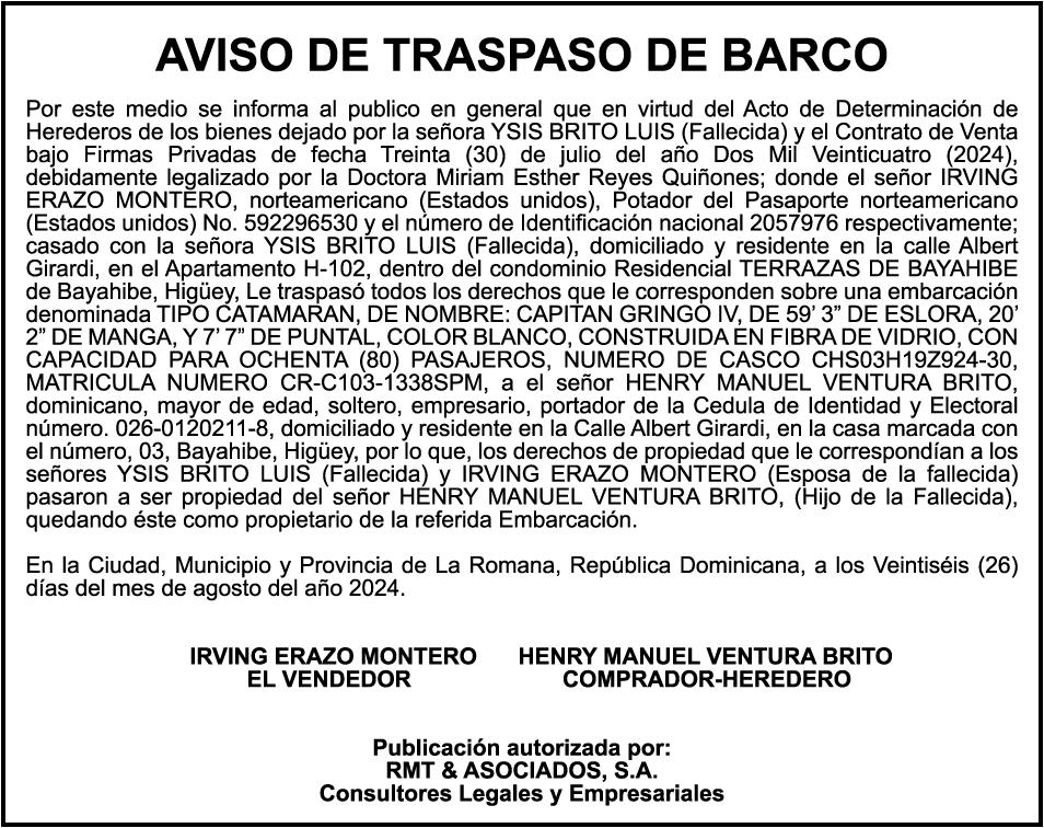 SE hace de conocimiento la cancelación de registro del catamarán de pesca de nombre BIG BLUE-I, de 42 pies de eslora, matricula no. CP-B21-623PP, propiedad de la Cia. LAZULI SAILING SRL, REP. POR EL señor LUC ALAIN NORBERT GUESSARD.