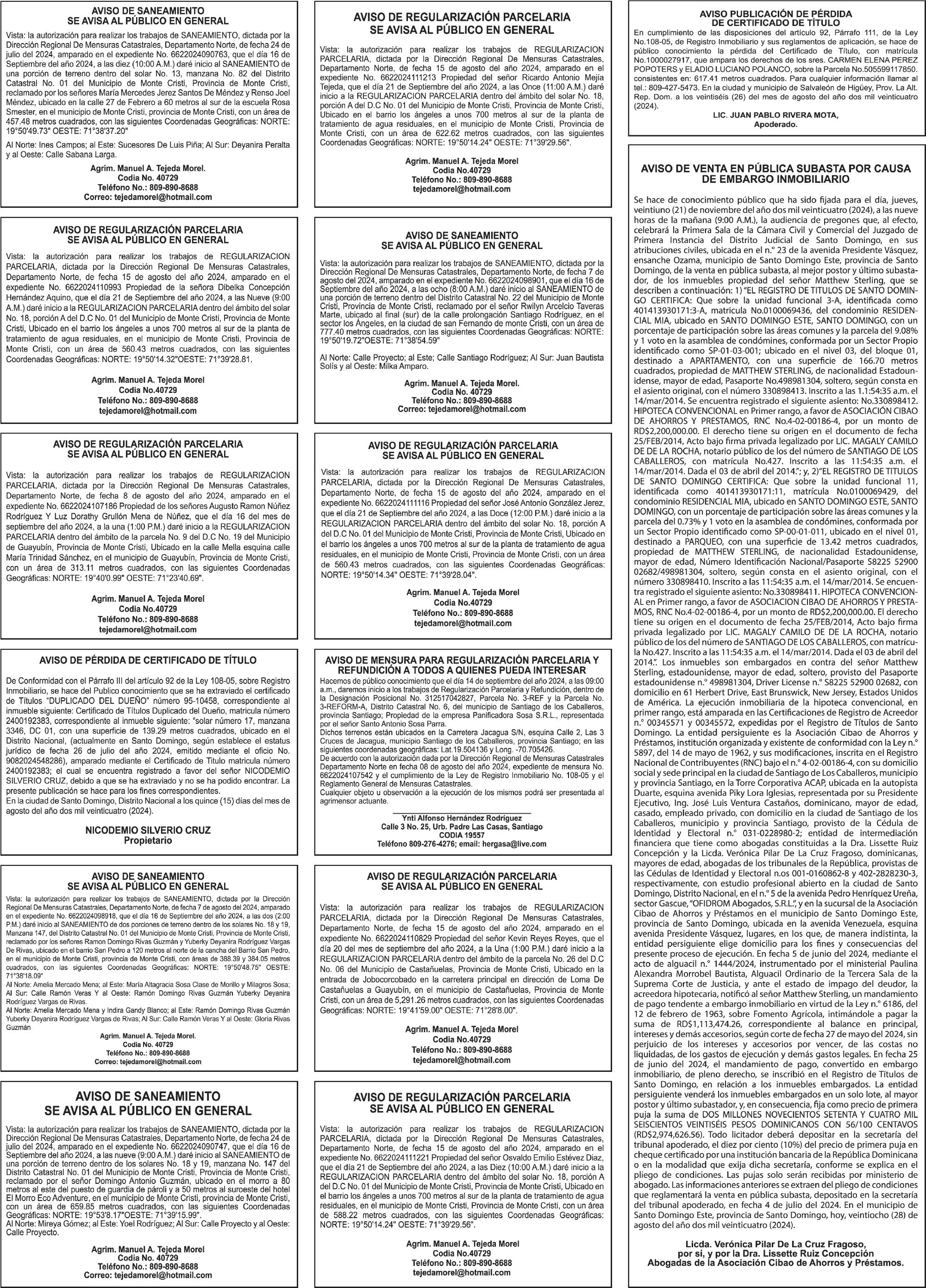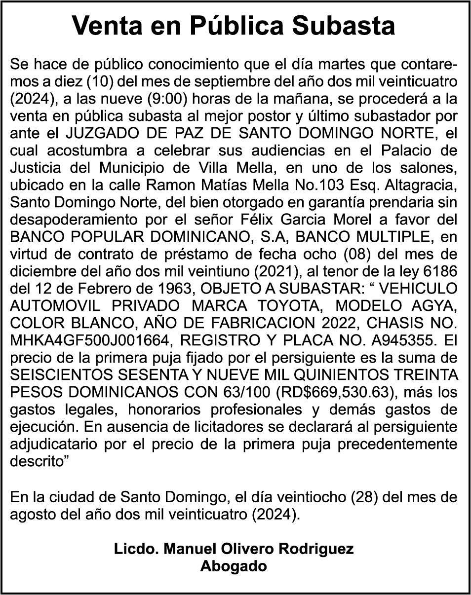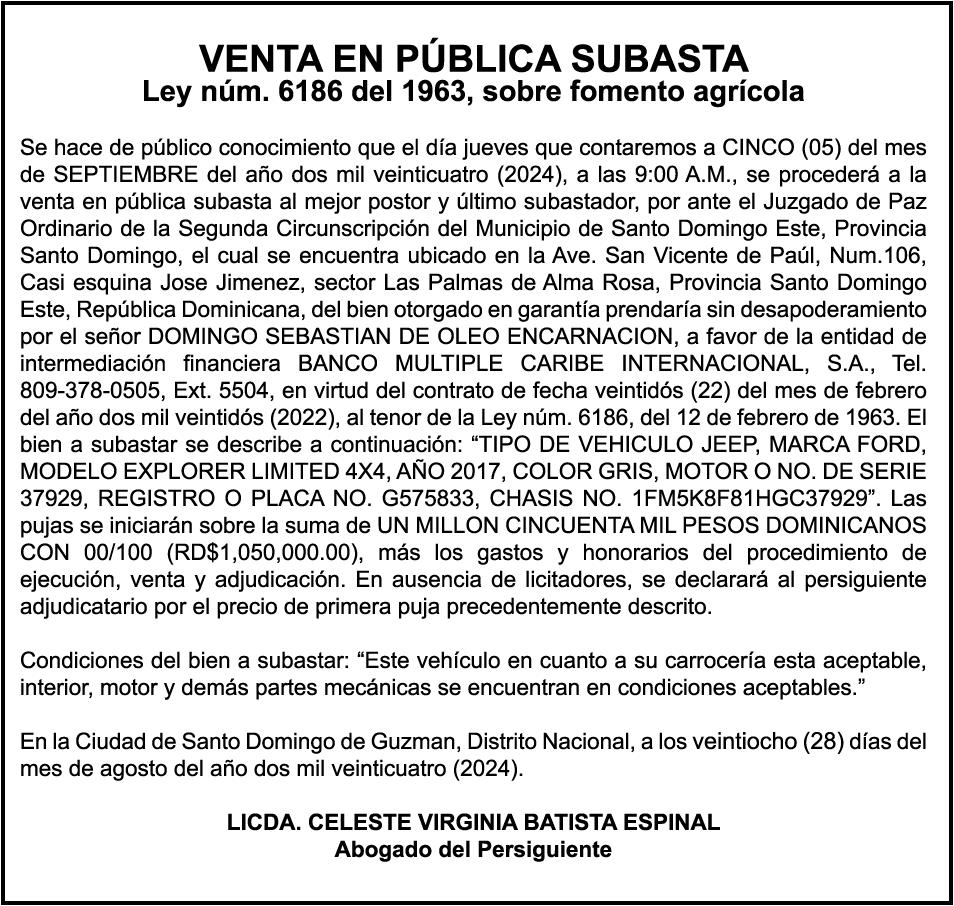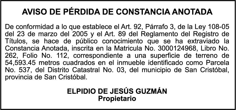 PERDIDA DE MATRICULA: Vehículo Marca Chevrolet, Modelo Equinox, Placa No. G338079, Año 2011, color Negra, Chasis 2GNALBEC6BEC6B1196003, Propiedad de Cesar Montas Abreu.