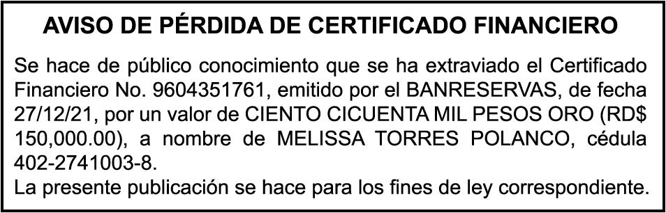 SE hace de público conocimiento la pérdida del Certificado Financiero número 794976126 emitido por Banco Popular Dominicano, S. A., a favor YULY YOKASTA DORSINE MONEGRO, portadora de Cedula de Identidad y Electoral número 0260132045-6, certificado expedido en fecha 20 de enero de 2016 por el monto (RD$65,000.00).