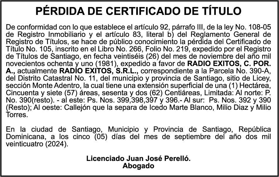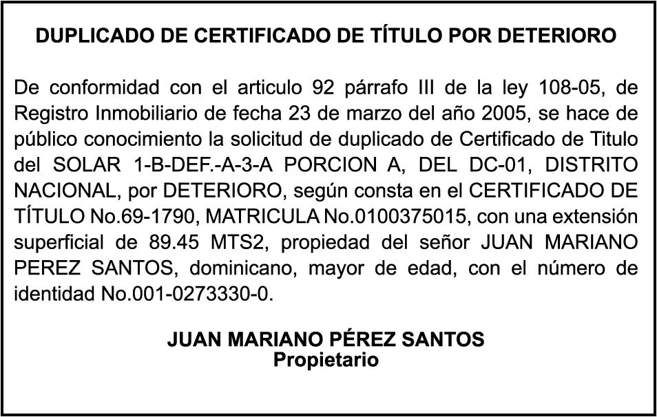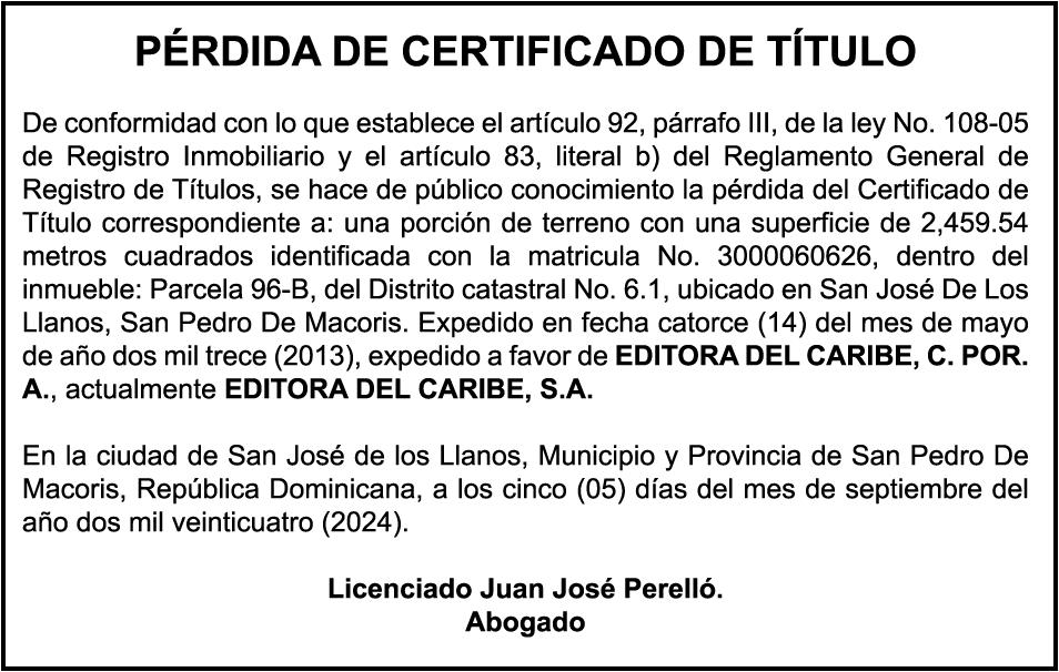 PERDIDA DE PLACA, marca BAJA, color AZUL, Placa s/n No, chasis MD2DZS1Z17FK00175, tipo Motocicleta, año ,2007, Dirección Nacional de PERDIDA DE CERTIFICADO FINANCIERO No. 62-600-36547, Código del Cliente No. 1069348, emitido por el BANCO DE AHORRO Y CREDITO FONDESA, S.A. (BANFONDESA), por un valor de RD$ 10, 000.00 CON 00/100( DIEZ MIL PESOS CON CERO CENTAVOS), Expedido en fecha 18/03/2024 , a nombre de LUIS ESTHEVAN PEREZ MERCEDES, Ced. No. 026-0144626-9