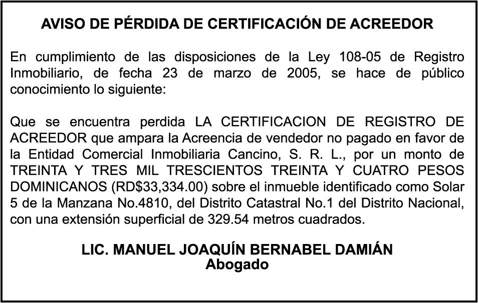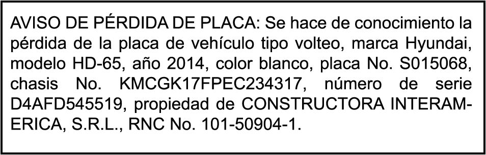 PERDIDA DE PLACA No. L341830, Veh. Carga ISUZU, color blanco, año 2015, chasis JAA1KR55EF7100902, a nombre de ELAINNY MARIA ALCANTARA MARTINEZ.