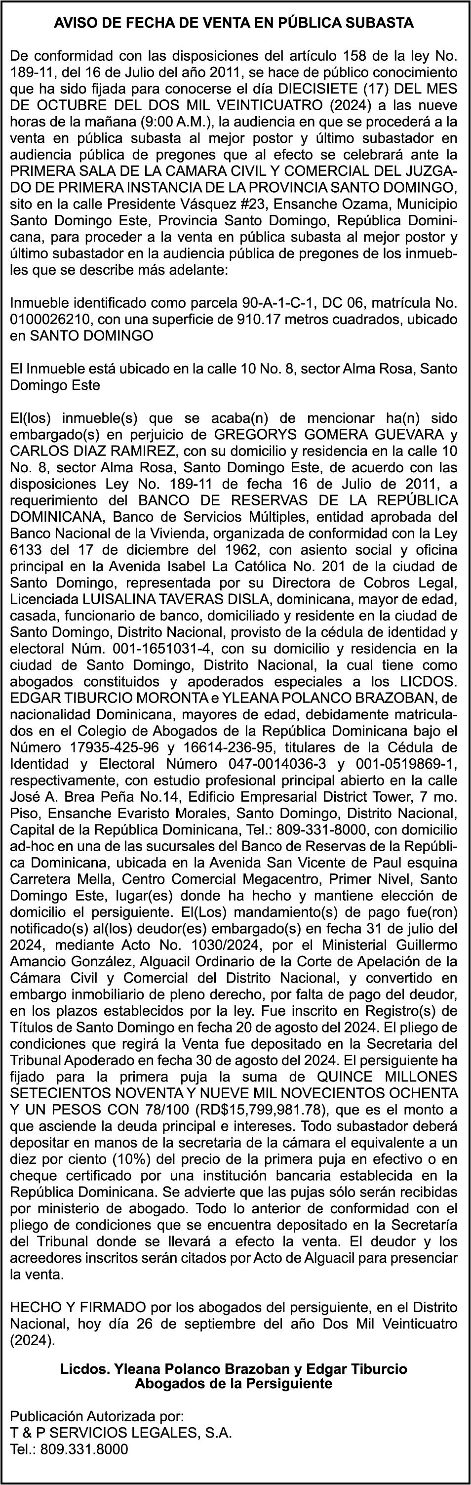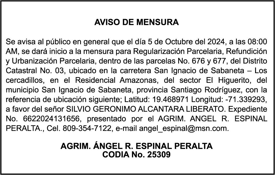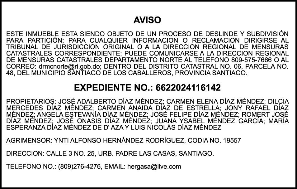 PERDIDA CERTIFICADO DE TITULO Perdida Certificado de Titulo que ampara una porción de terreno con una superficie de 62.83 Tareas, equivalente a 03HAS; 95AS; 11. dentro de la parcela No. 67-B, del DC No.11/3ra, ubicado en Higüey, al nombre de HECTOR SANTIAGO CASTILLO CRUZADO.