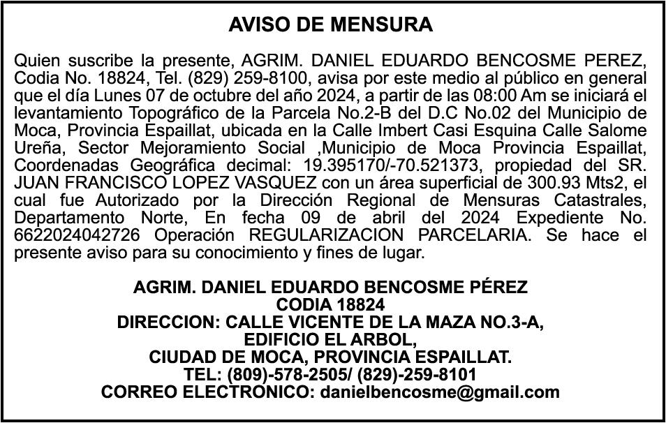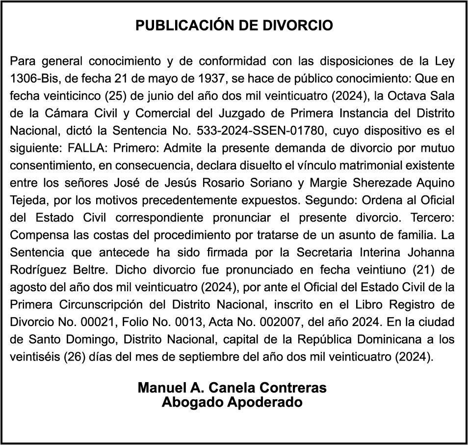 SE hace de público conocimiento la pérdida del Certificado Financiero número 838127496 emitido por Banco Popular Dominicano, S. A., a favor JOSE JONATHAN TEJADA ALCANTARA, dominicano, mayor de edad, soltero, domiciliado y residente en esta ciudad, portador de la Cédula de Identidad y Electoral número 225-0028843-0, certificado expedido en fecha 19 de diciembre de 2023 por el Monto (RD$103,458.92), mas intereses generados a la fecha.