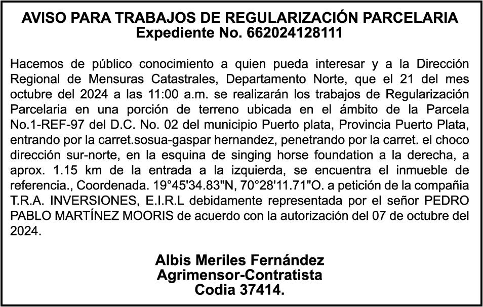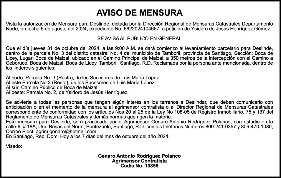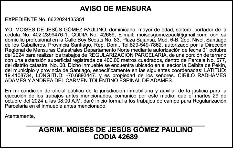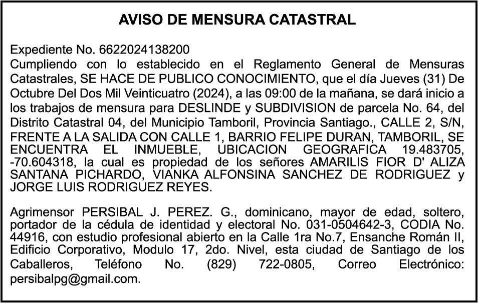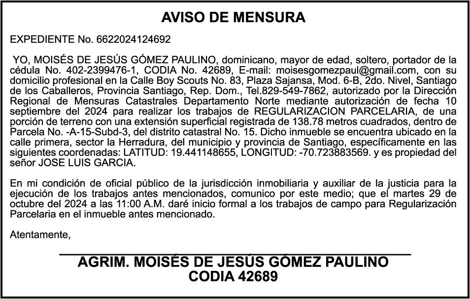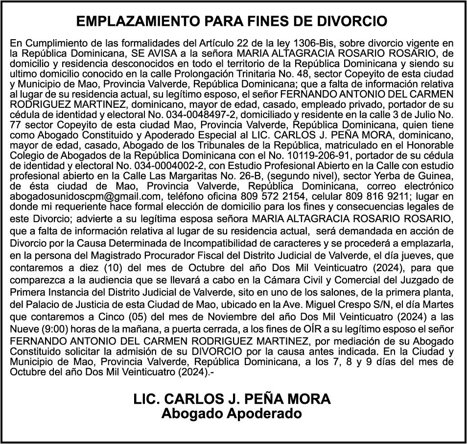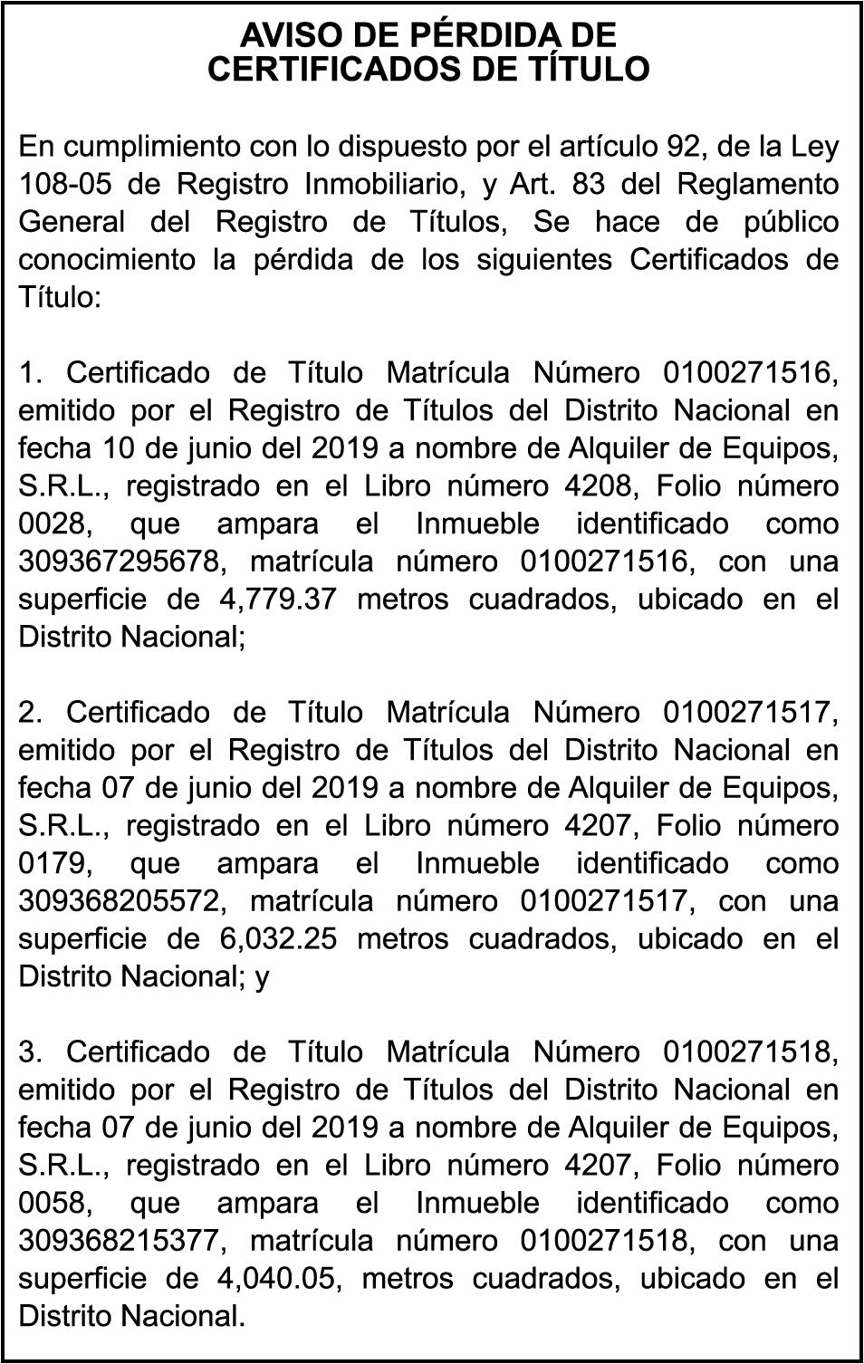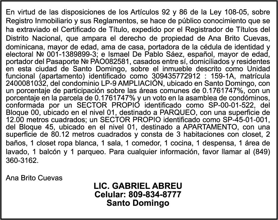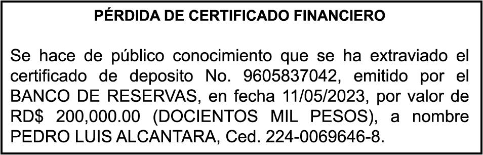 SE hace de público conocimiento la pérdida del Certificado Financiero número 833260631 emitido por Banco Popular Dominicano, S. A., a EVARISTO NUÑEZ, dominicano, mayor de edad, casado, domiciliado y residente en esta ciudad, portador de la Cédula de Identidad y Electoral número 001-0407086-7, certificado expedido en fecha 12 de abril de 2023 por el Monto (RD$131,086.81), mas intereses generados a la fecha.