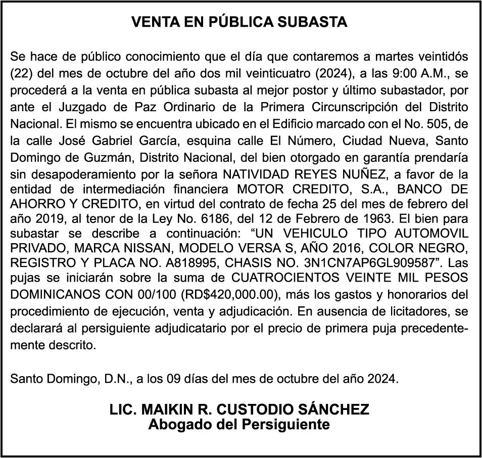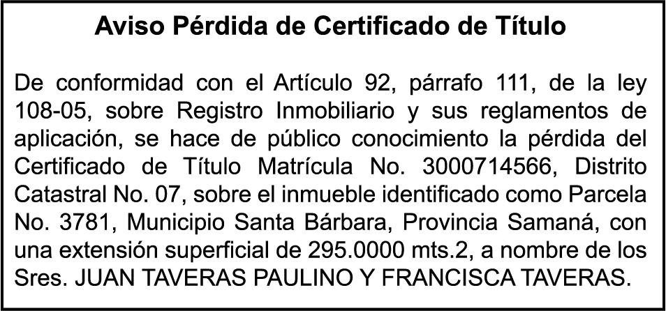 SE hace de público conocimiento la pérdida del Certificado Financiero número 799257092 emitido por Banco Popular Dominicano, S. A., a CATHERINE JANILKIS DIONICIO DIONICIO, portadora de la Cédula de Identidad y Electoral número 002-0112621-6, certificado expedido en fecha 24 de octubre de 2016 por el Monto (RD$1,267,778.15), mas intereses generados a la fecha.