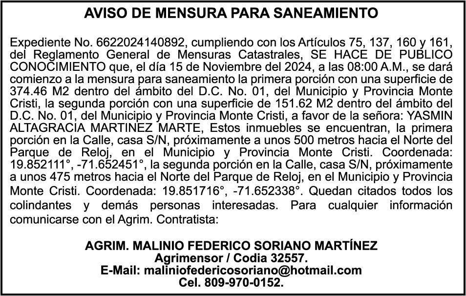 AVISO: cambio de nombre de embarcación. Se hace de público conocimiento, que se le está cambiando el nombre al catamarán de recreo de nombre "YEREMI GARCIA", de 34.0 pies de eslora, matricula No. CR-Y122-2674SBS, propiedad del señor JULIO CESAR BERROA JIMENEZ, para que en lo adelante se haga figurar con el nombre de "JULIO ADRIAM", en vez del primero.