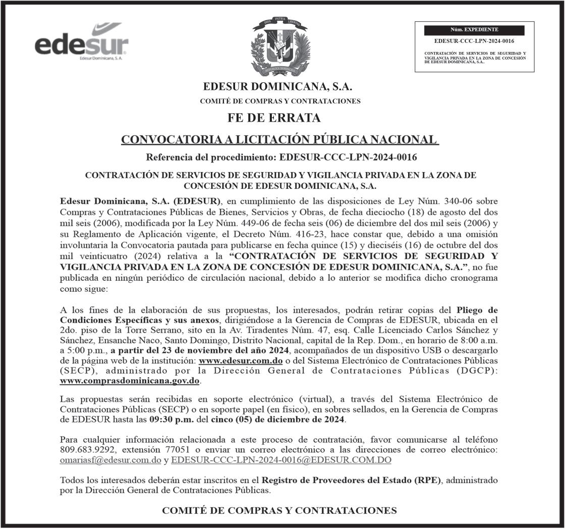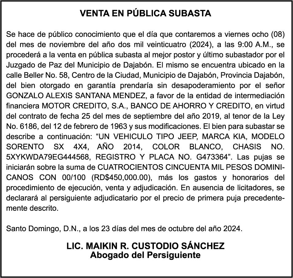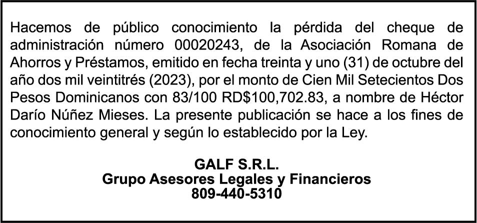 SE hace de público conocimiento la pérdida de certificado financiero número 837099167 emitido por Banco Popular Dominicano, S. A., a favor de NELSON RAFAEL PEÑA BURGOS, expedido en fecha 31 de octubre de 2023 por el monto de (US$300,000.00), de capital más intereses generados a la fecha por concepto de cancelación.