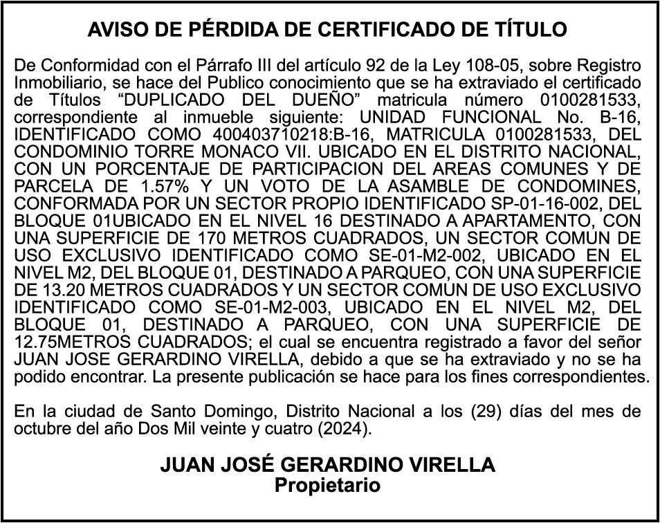 SE hace de público conocimiento la pérdida de certificado financiero número 806583035 emitido por Banco Popular Dominicano, S. A., a favor de YSMAEL JOSE LLUVERES UREÑA Y LUCY TANIA MENDEZ MEDINA, expedido en fecha 26 de febrero de 2018 por el monto (US$10,390.00) y el Certificado Financiero número 821872611 de fecha 10 de mayo 2021 por valor de QUINCE MIL DOLARES DE LOS ESTADOS UNIDOS DE AMERICA (US$15,000.00), de capital más intereses generados a la fecha por concepto de cancelación.