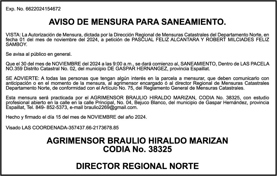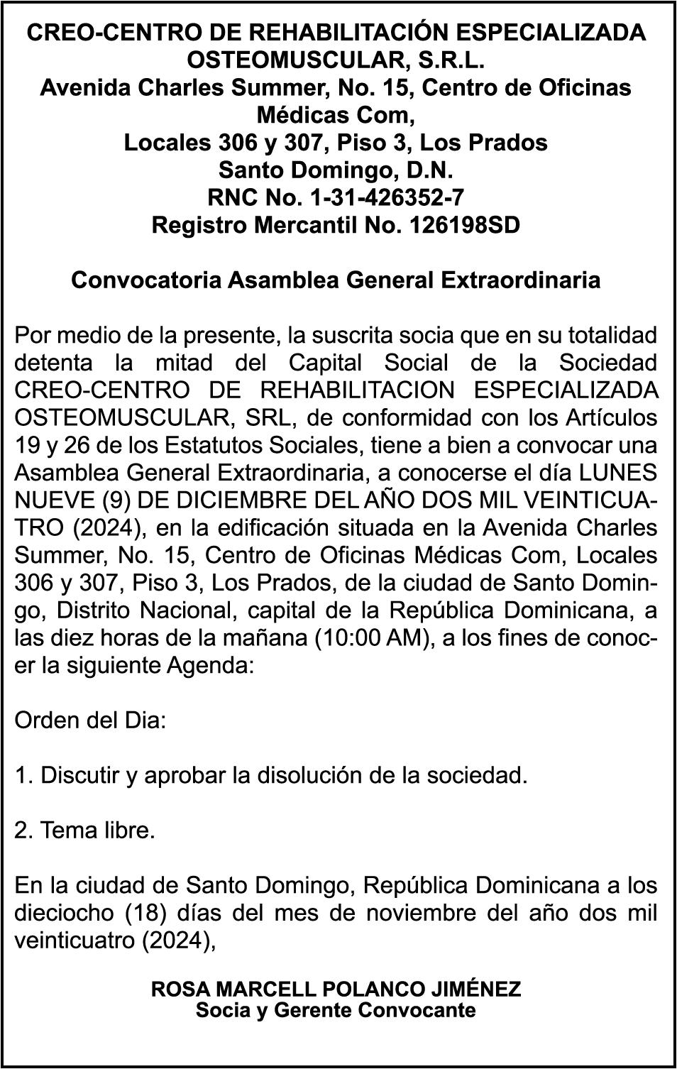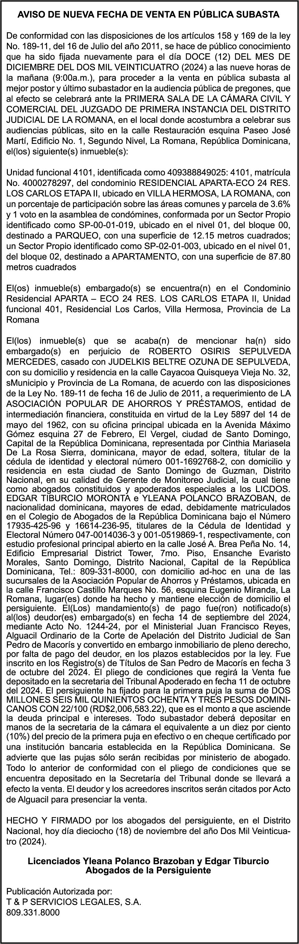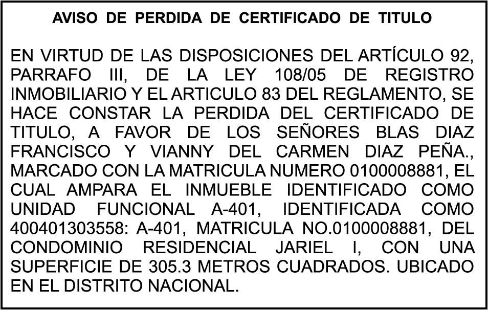 SE hace de público conocimiento la pérdida del Certificado Financiero número 844579409 emitido por Banco Popular Dominicano, S. A., a EDWIN MARTINEZ MARTINEZ, portador de la Cédula de Identidad y Electoral número 001-1213630-4, certificado expedido en fecha 7 de octubre de 2024 por el Monto (RD$447,741.76), mas intereses generados a la fecha.