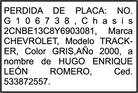 PERDIDA DE PLACA: NO. A136978, MARCA: TOYOTA, MODELO: COROLLA CE, AÑO: 1993, COLOR: VERDE, CHASIS NO. 2T1AE04E6PC010284, REGISTRO , MATRICULA NO. 12946967, PROPIEDAD DEL SEÑOR MANUEL ERNESTO ARIAS NUÑEZ.