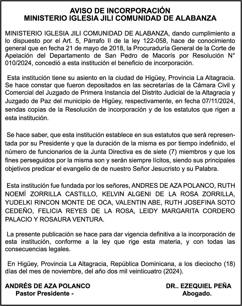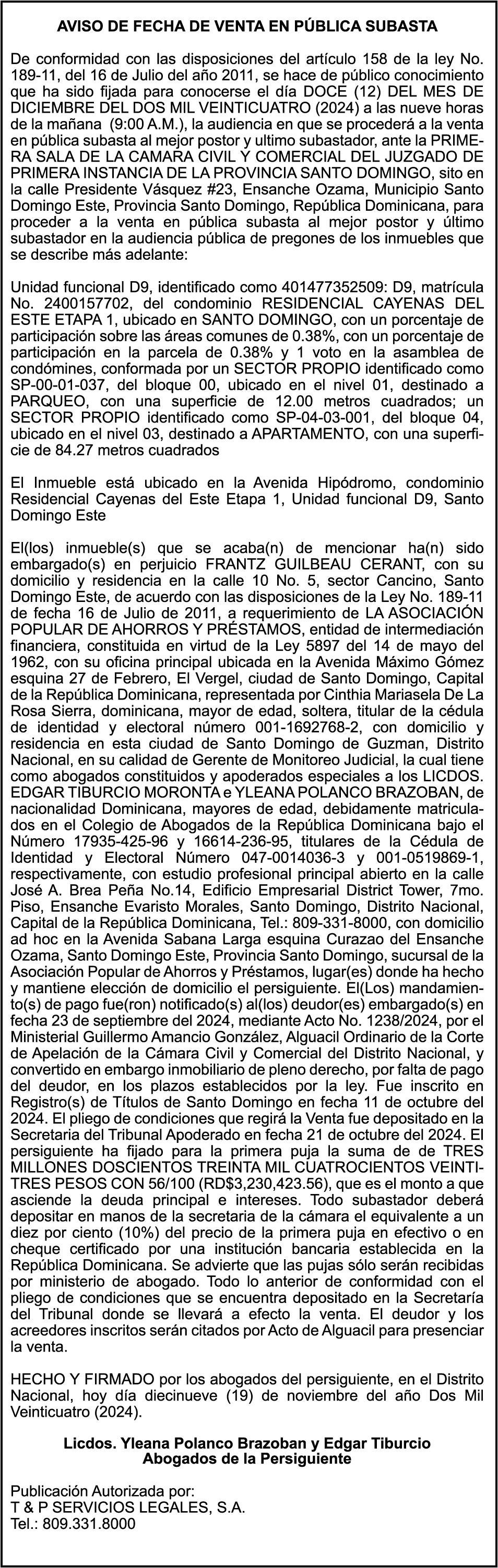 SE hace de público conocimiento la pérdida del Certificado Financiero número 844579409 emitido por Banco Popular Dominicano, S. A., a EDWIN MARTINEZ MARTINEZ, portador de la Cédula de Identidad y Electoral número 001-1213630-4, certificado expedido en fecha 7 de octubre de 2024 por el Monto (RD$447,741.76), mas intereses generados a la fecha.