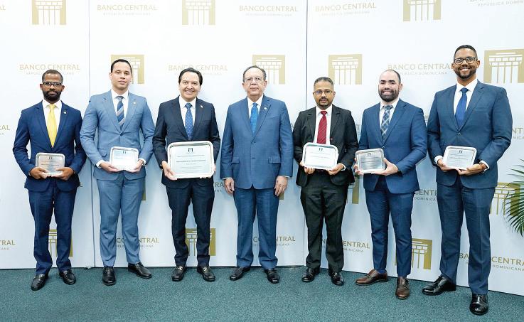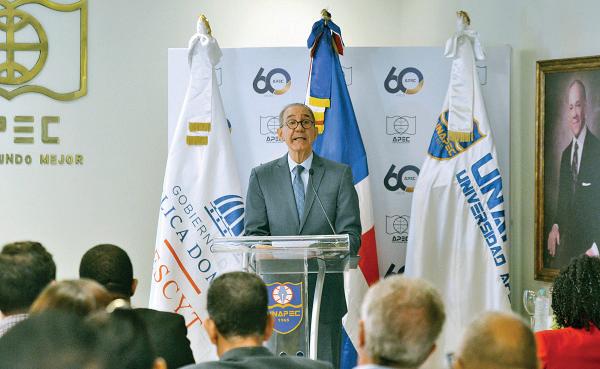 De izquierda a derecha, Milagros Germán, Carolina Mejía, Christopher Paniagua, Luis Abinader, Manuel A. Grullón, Rosa Hernández de Grullón, Manuel García Arévalo y Manuel E. Jiménez. F., durante el acto formal de apertura. P.12