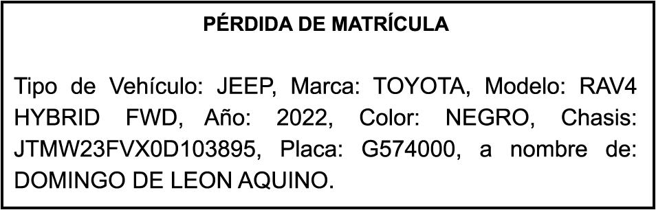 PERDIDA DE PLACA: NO. G574480, Chasis 3N8CP5HE9ZL618671, Marca NISSAN, Modelo KICKS ADVANCE, AñO 2022, Color BLANCO,a nombre de EDWIN ENRIQUE PEREZ DIAZ, Ced. 03102327727