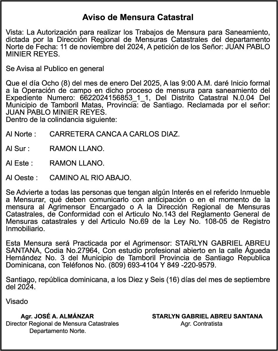 PERDIDA DE MATRICULA del automóvil privado marca FORD, Modelo TAURUS, año 2013, color BLANCO, Placa No. A602462, Chasis No. 1FAHP2E81DG210974, a nombre de JULIO MERCEDES RODRIGUEZ RAMIREZ PERDIDA DE PLACA No. K2502031, Motocieleta HERO, Modelo ECO DELUXE, Color NEGRO/GRIS, Año 2024, Chasis MBLHAR021R9N00019, a nombre de COMERCIAL ALCIVIADES HERNADEZ SRL.