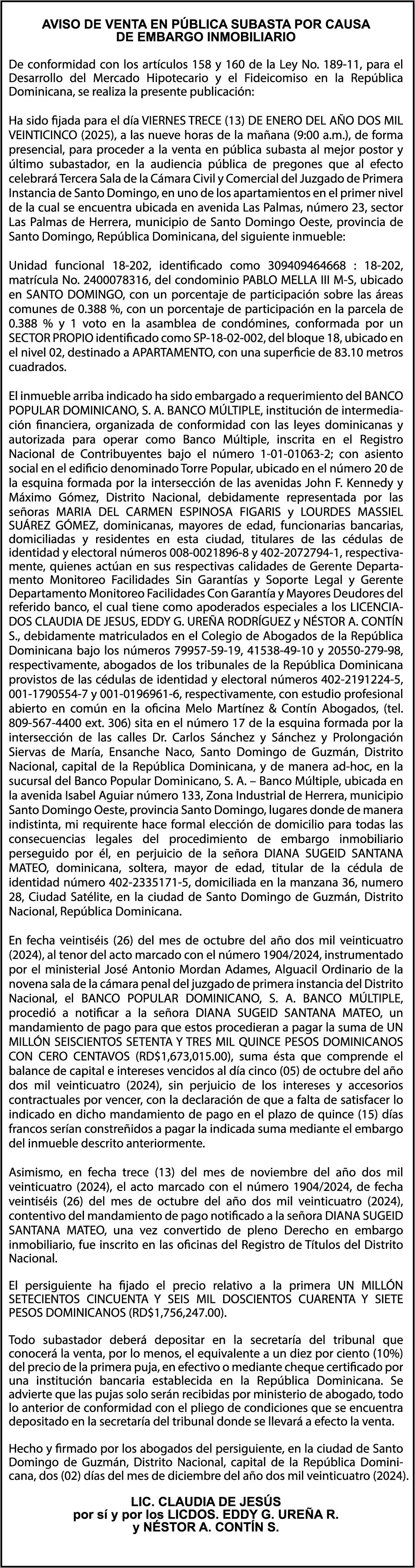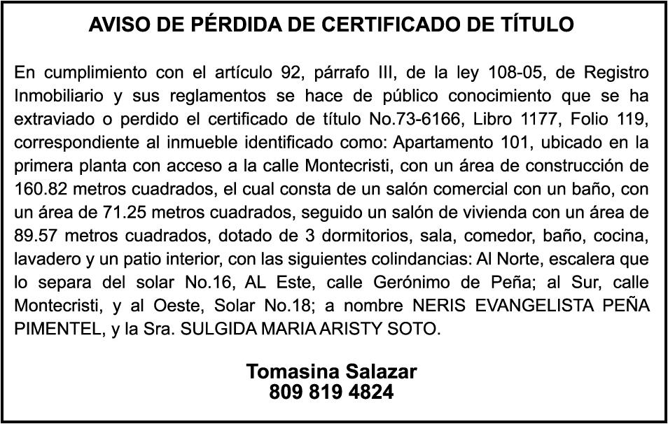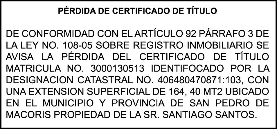SE hace de público conocimiento la pérdida del Certificado Financiero número 711661777 emitido por Banco Popular Dominicano, S. A., a ISAAC JACQUES SAGUES , dominicano, mayor de edad, soltero, con elección de domicilio en esta ciudad, portadora de la Cédula de Identidad y Electoral número 001-1266931-2, certificado expedido en fecha 31 de julio de 2003 por el Monto (RD$10,969.33), mas intereses generados a la fecha.