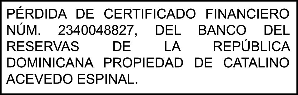 SE HA EXTRAVIADO el Certificado Finaciero cuenta de ahorro No 080-0508984, libreta No. 5031138, emitido por BANRESERVAS por el monto de RD$100,000.00, a nombre de la Sra. JACQUELINE RODRIGUEZ DE LOS SANTOS.