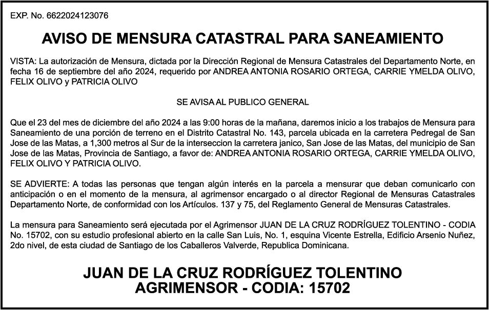 SE hace de público conocimiento la pérdida del Certificado Financiero número 843983339 emitido por Banco Popular Dominicano, S. A., a nombre de JOSE ALEXANDRO DE LA CRUZ ORTIZ, dominicano, mayor de edad, soltero, domiciliado y residente en esta ciudad, portador de la Cédula de Identidad y Electoral número 048-0064365-4, certificado expedido en fecha 9 de septiembre de 2024 por el monto de (RD$1,000,000.00), mas intereses generados a la fecha.