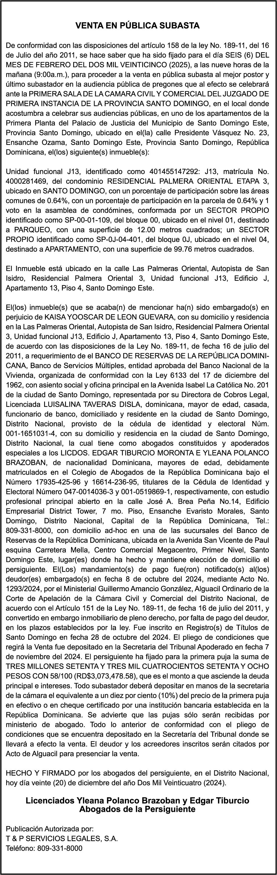 SE hace de público conocimiento la pérdida del Certificado Financiero número 843477324 emitido por Banco Popular Dominicano, S. A., a nombre de ROCIO DEL PILAR GARCIA BRITO, dominicano, mayor de edad, soltero, portador de la Cédula de Identidad y Electoral número 402-2656168-2, certificado expedido en fecha 15 de agosto de 2024 por el monto de (RD$769,983.48), mas intereses generados a la fecha.