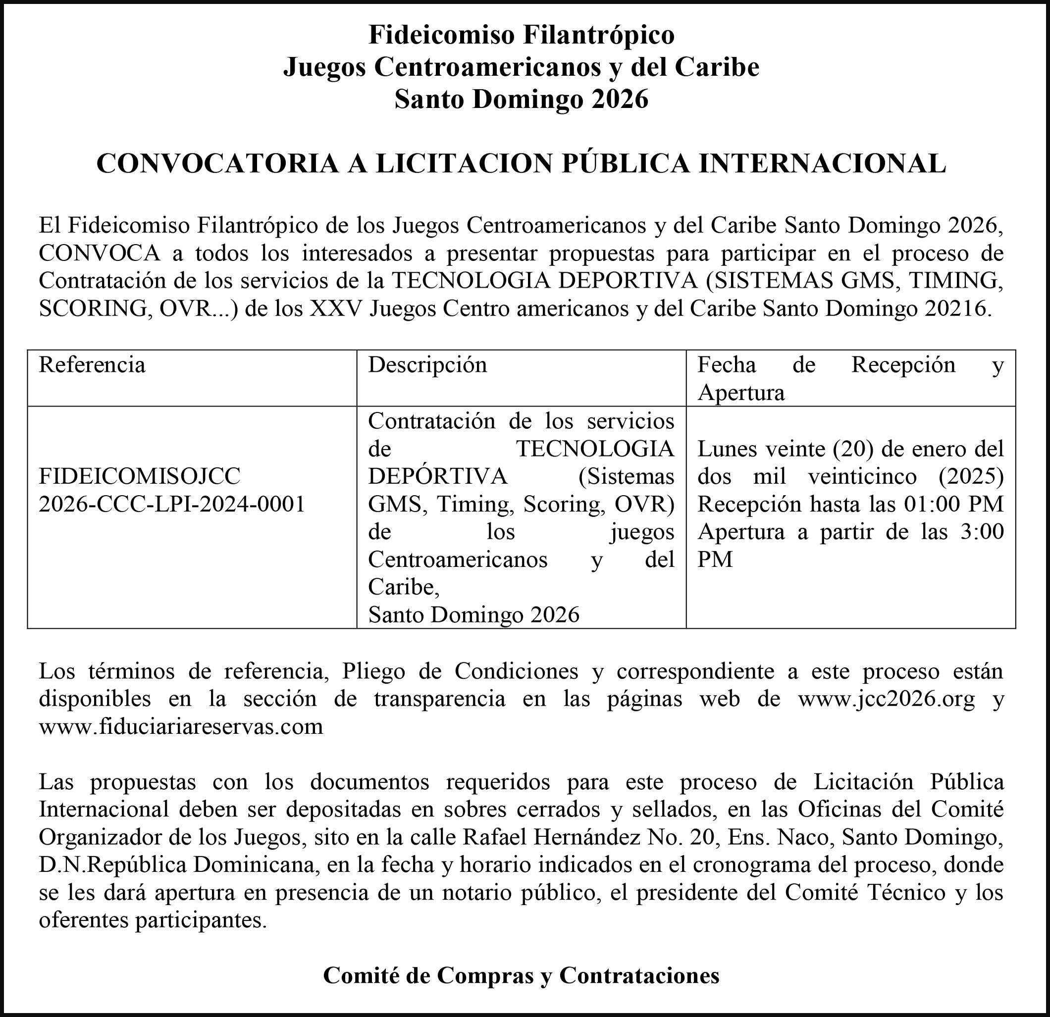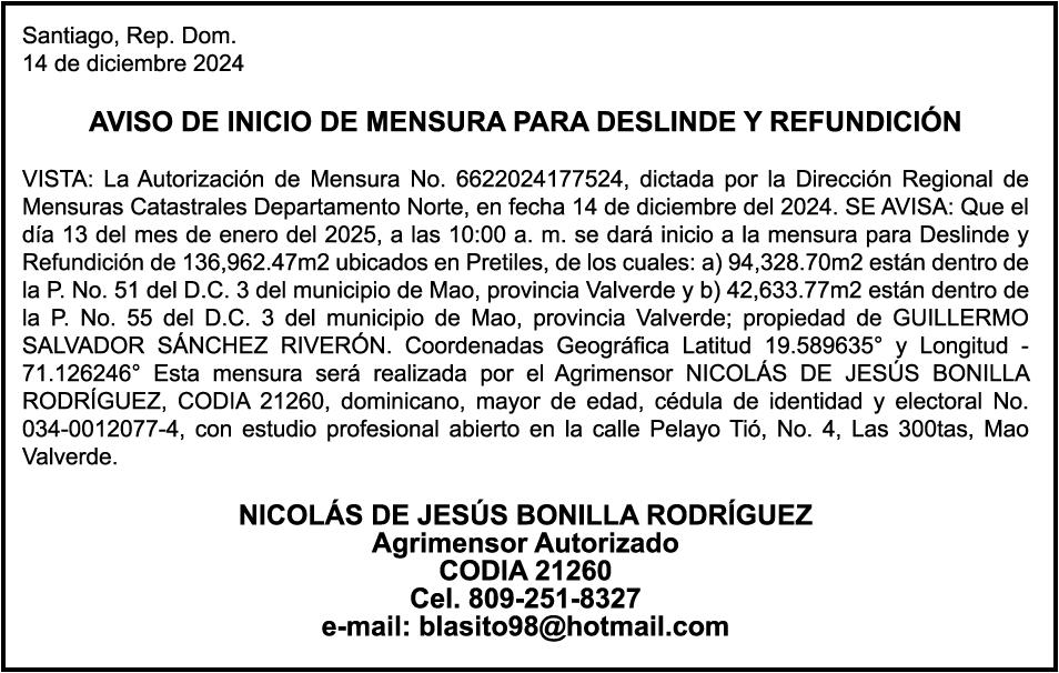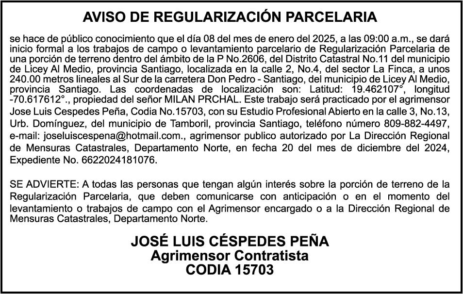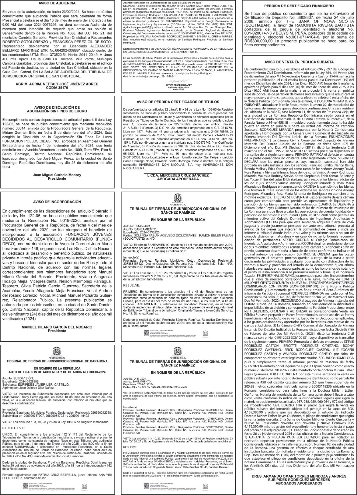 PERDIDA DE MATRICULA: Del JEEP, Placa G271167, Chasis JTMZD32V865007358, Marca TOYOTA, Modelo RAV4, Color BLANCO, AñO 2006, a nombre de SONIA TERESA DIAZ SANTOS, Ced. 03103695452 SE hace de público conocimiento la pérdida del Certificado Financiero número 843481250 emitido por Banco Popular Dominicano, S. A., a nombre de ROCIO DEL PILAR GARCIA BRITO, dominicano, mayor de edad, soltero, portador de la Cédula de Identidad y Electoral número 402-2656168-2, certificado expedido en fecha 15 de agosto de 2024 por el monto de (RD$750,000.00), mas intereses generados a la fecha. SE hace de público conocimiento la pérdida del Certificado Financiero número 843942772 emitido por Banco Popular Dominicano, S. A., a nombre de JAIME DANIEL AYBAR OVALLE, dominicano, mayor de edad, soltero, con elección de domicilio en esta ciudad, portadora de la Cédula de Identidad y Electoral número 001-1556824-8, certificado expedido en fecha 6 de septiembre de 2024 por el Monto (RD$4,000,000.00), mas intereses generados a la fecha.