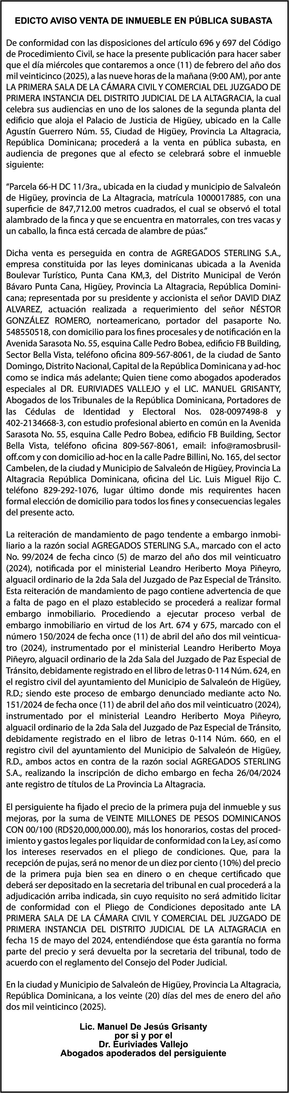 PERDIDA CERTIFICADO DE TITULO Matrícula 3000110016, DC 11/3ra, Parcela 66P, que ampara una porción de terreno con una superficie de 79,498.50 mts2 ubicado en Higüey, al nombre de BENITA RUIZ PAULINO.