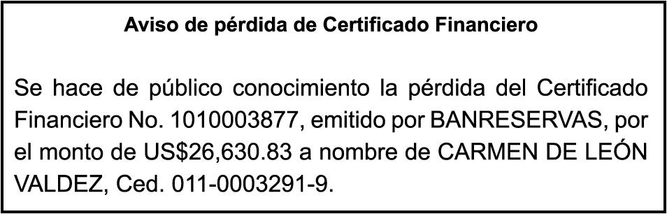 PERDIDA Certificado Financiero de la Asociación Nacional de Ahorros y Préstamos, por un valor de Ciento Sesenta Mil Pesos (160,000.00),. Prop. De la Sra. YSABEL CARLITA MATEO FLORENTINO