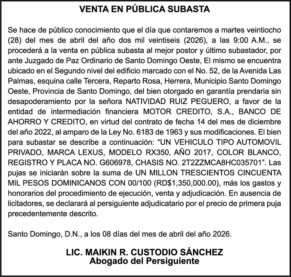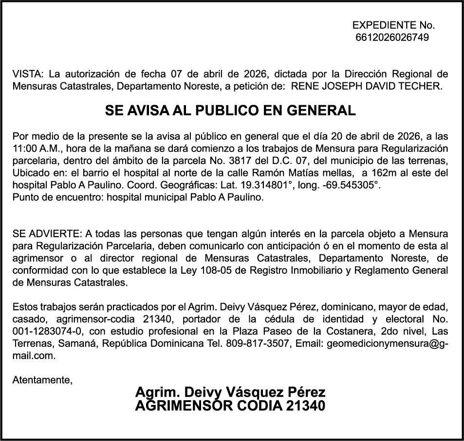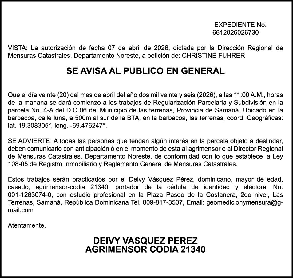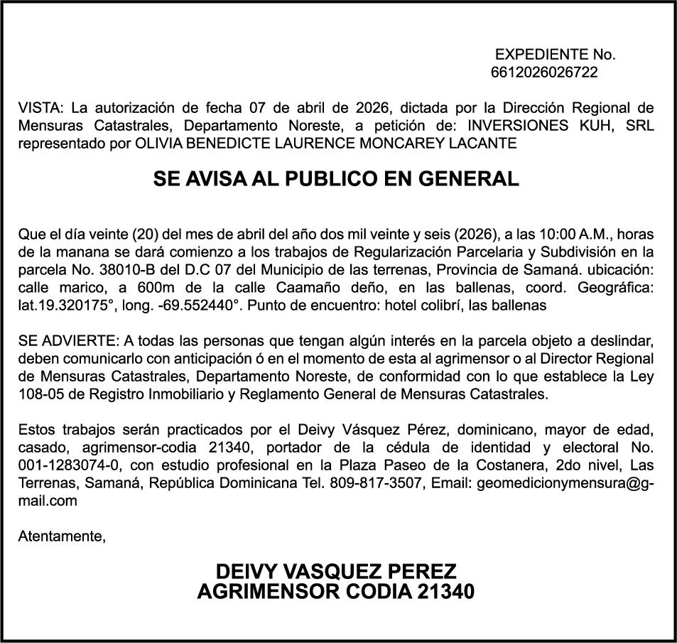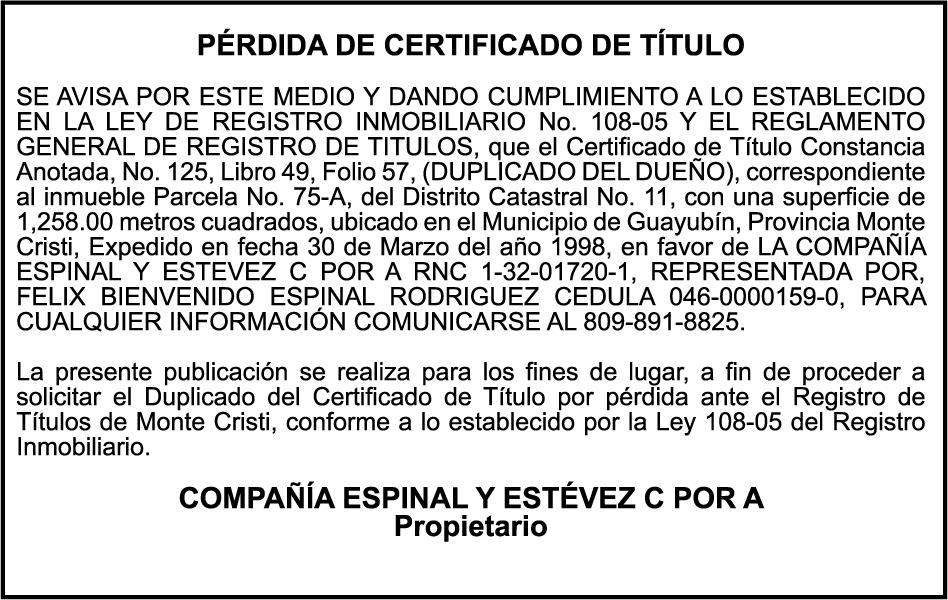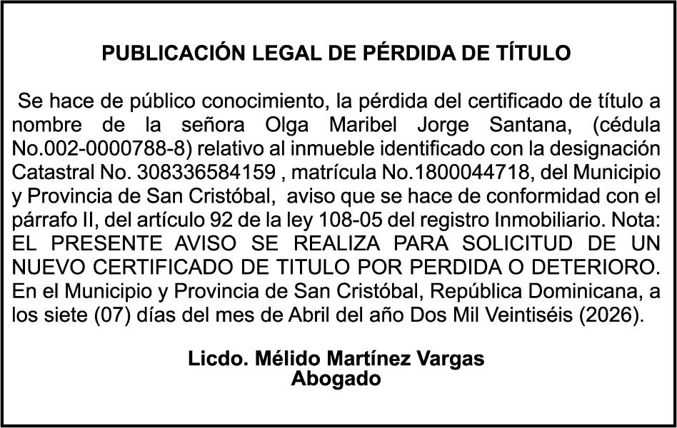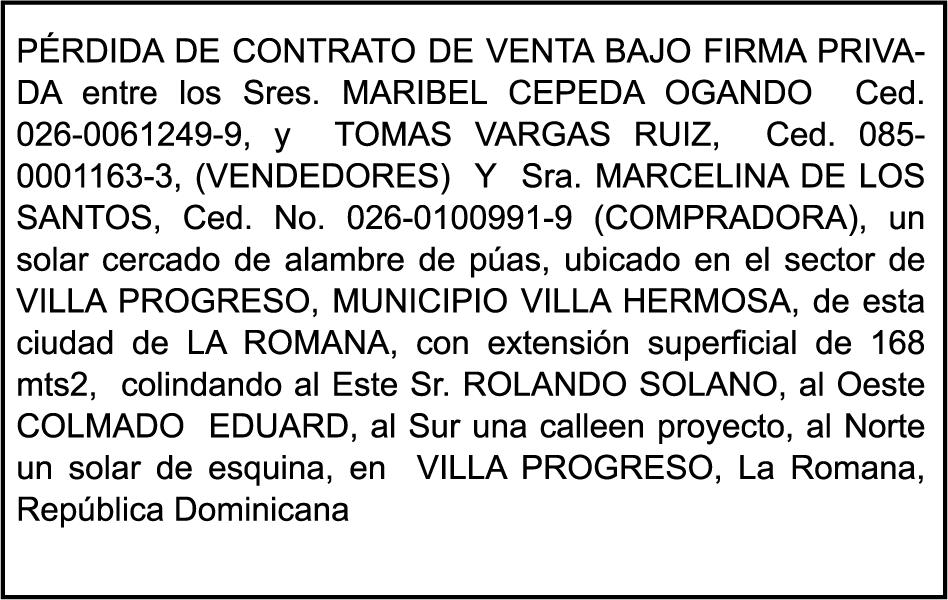 PERDIDA DE PLACA No. L329487, CARGA MITSUBISHI, color BLANCO, año 2006, chasis FE635EA48653, a nombre de ADVENTURE BOOGIES SRL AVISO TRASPASO DE EMBARCACION.EL señor MARIO MERCEDES, traspasa el bote de pesca de nombre;LUCIA-IV” matricula No. BP-L180-861SBS, de 19.0 pies de eslora, para que en lo adelante figure a nombre del señor RODOLFO FRANCO GUZMAN , como nuevo ropietario.