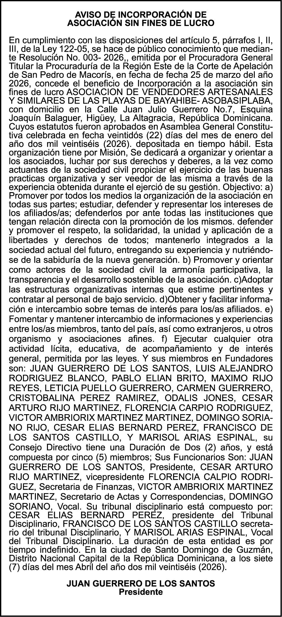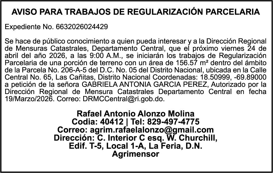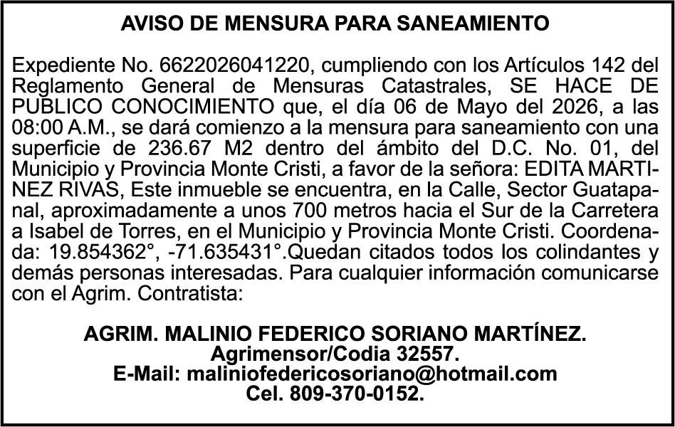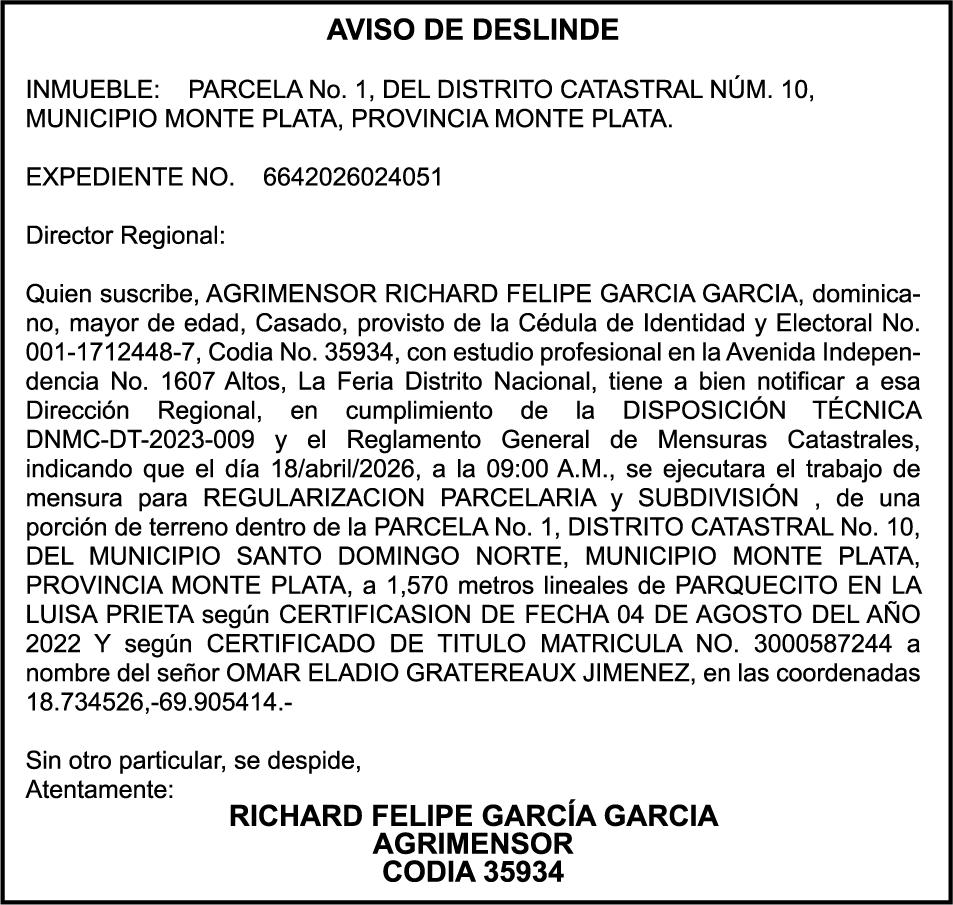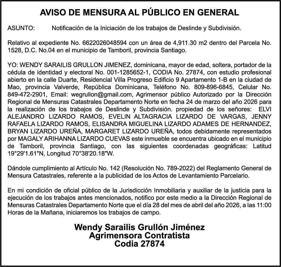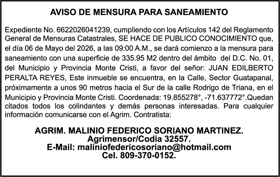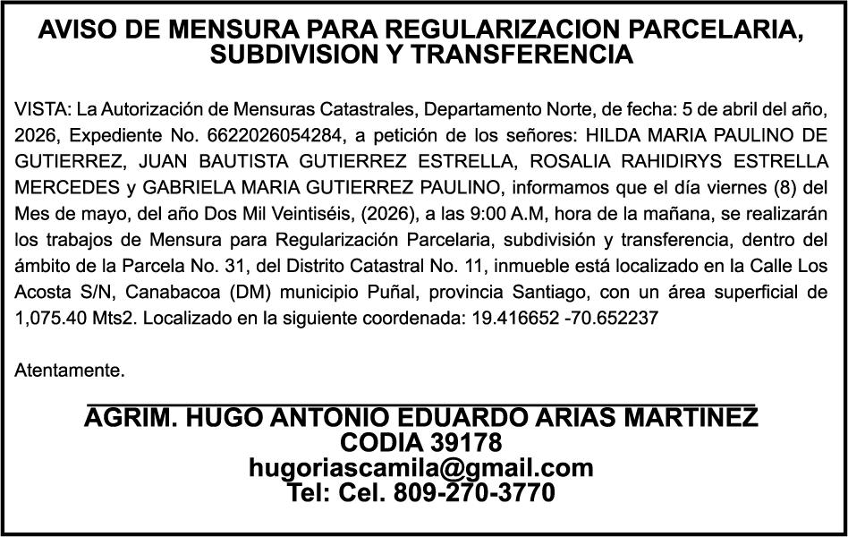 PERDIDA DE PLACA No. L329487, CARGA MITSUBISHI, color BLANCO, año 2006, chasis FE635EA48653, a nombre de ADVENTURE BOOGIES SRL AVISO TRASPASO DE EMBARCACION.EL señor MARIO MERCEDES, traspasa el bote de pesca de nombre;LUCIA-IV” matricula No. BP-L180-861SBS, de 19.0 pies de eslora, para que en lo adelante figure a nombre del señor RODOLFO FRANCO GUZMAN , como nuevo ropietario.