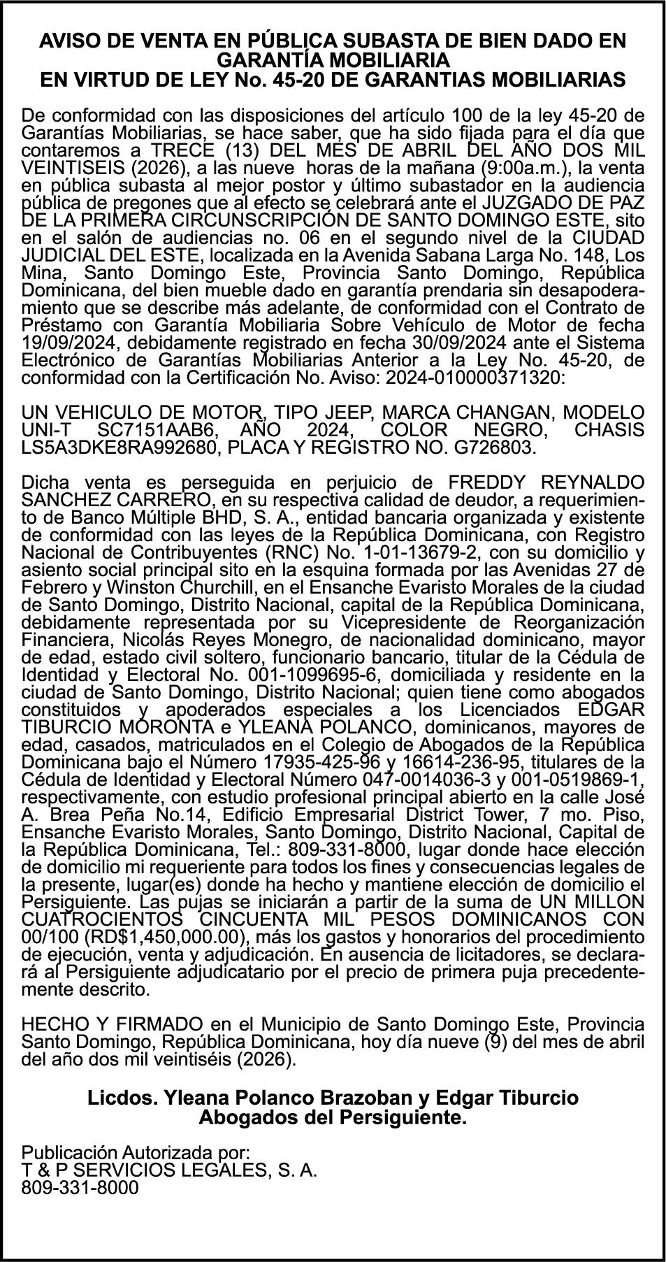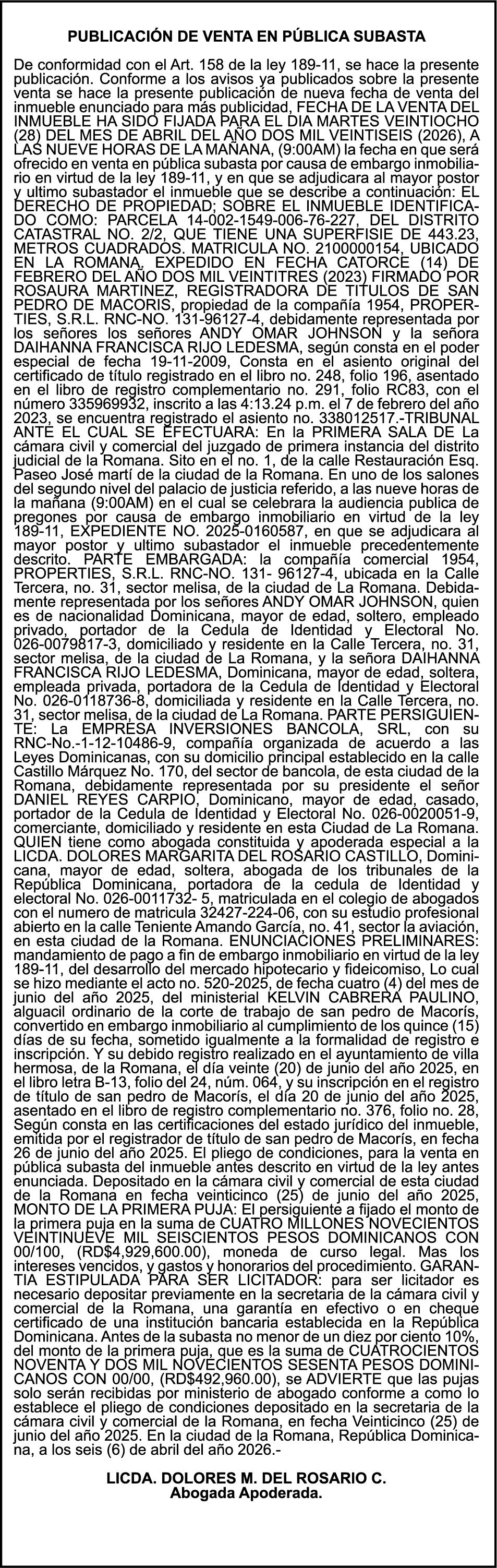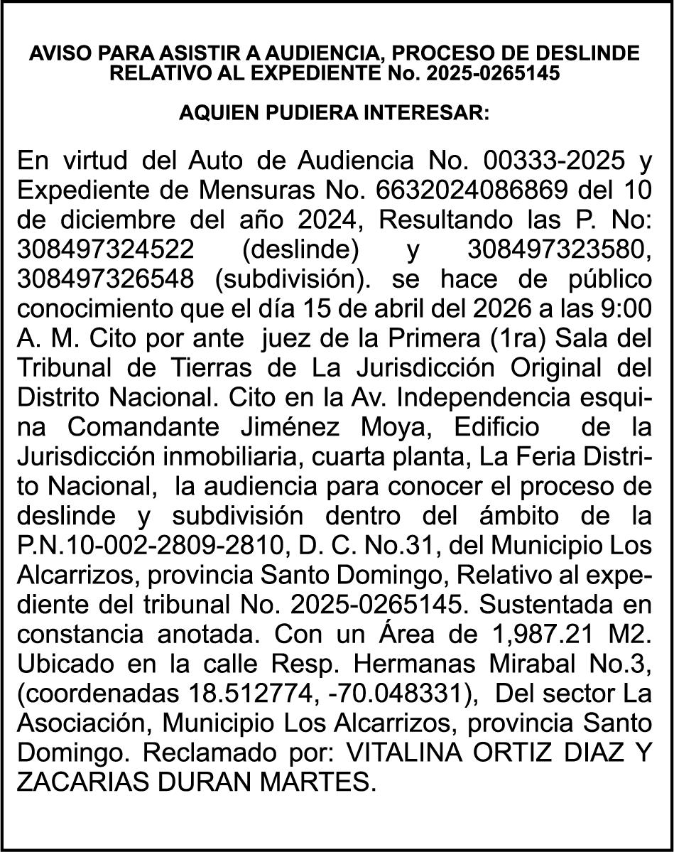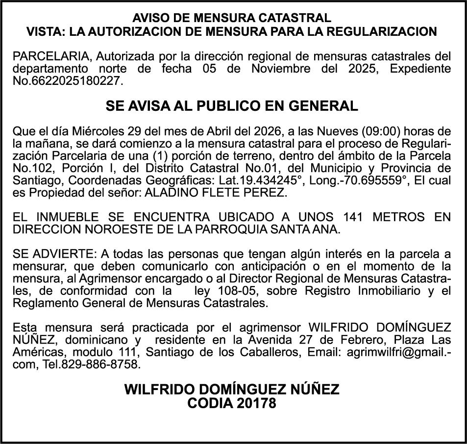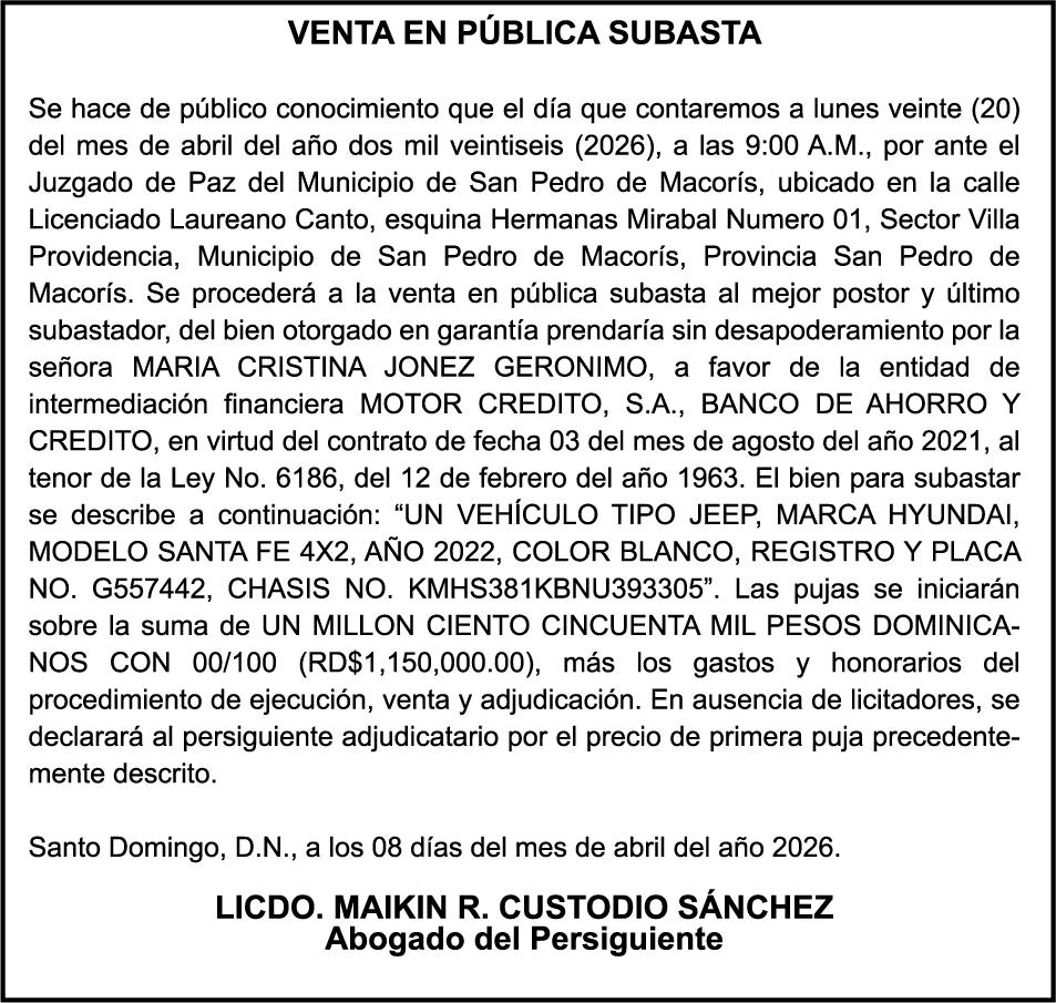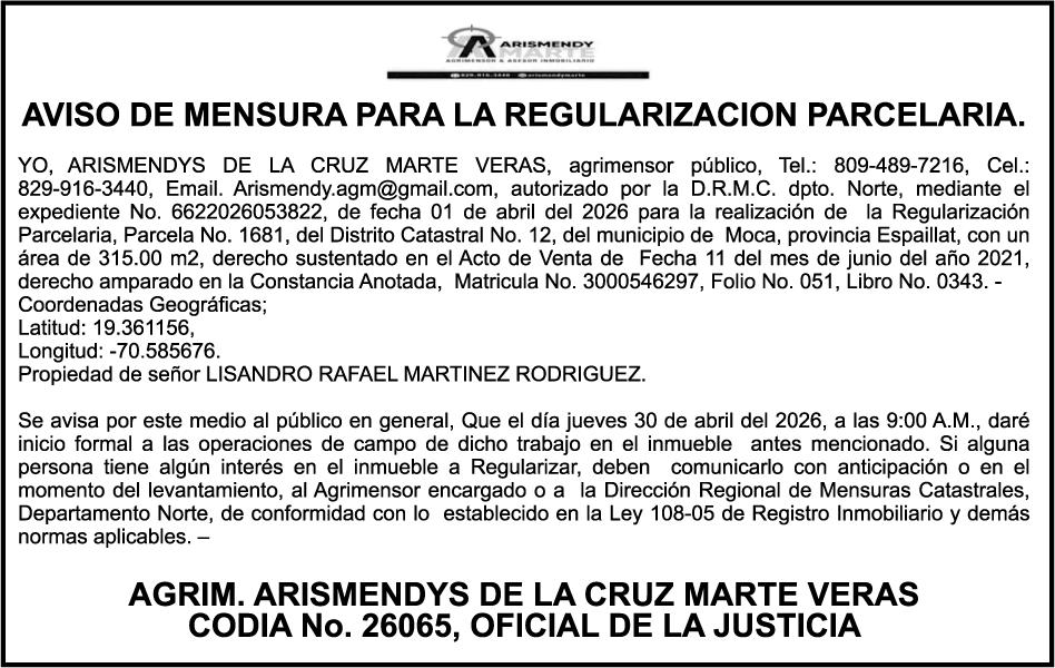 PERDIDA DE PLACA No. L329487, CARGA MITSUBISHI, color BLANCO, año 2006, chasis FE635EA48653, a nombre de ADVENTURE BOOGIES SRL AVISO TRASPASO DE EMBARCACION.EL señor MARIO MERCEDES, traspasa el bote de pesca de nombre;LUCIA-IV” matricula No. BP-L180-861SBS, de 19.0 pies de eslora, para que en lo adelante figure a nombre del señor RODOLFO FRANCO GUZMAN , como nuevo ropietario.