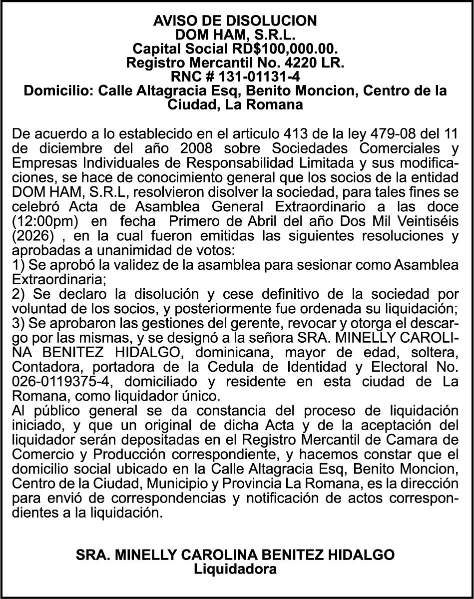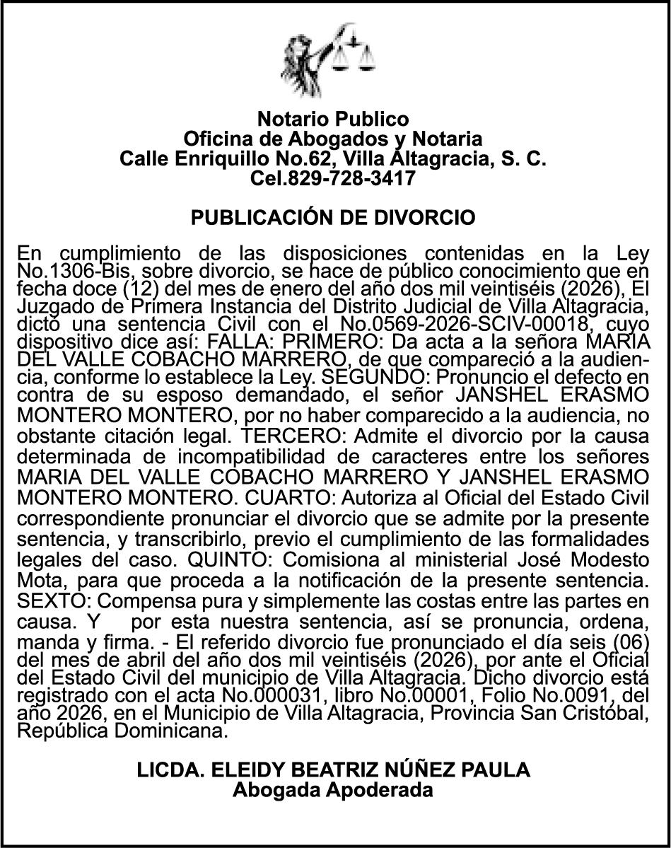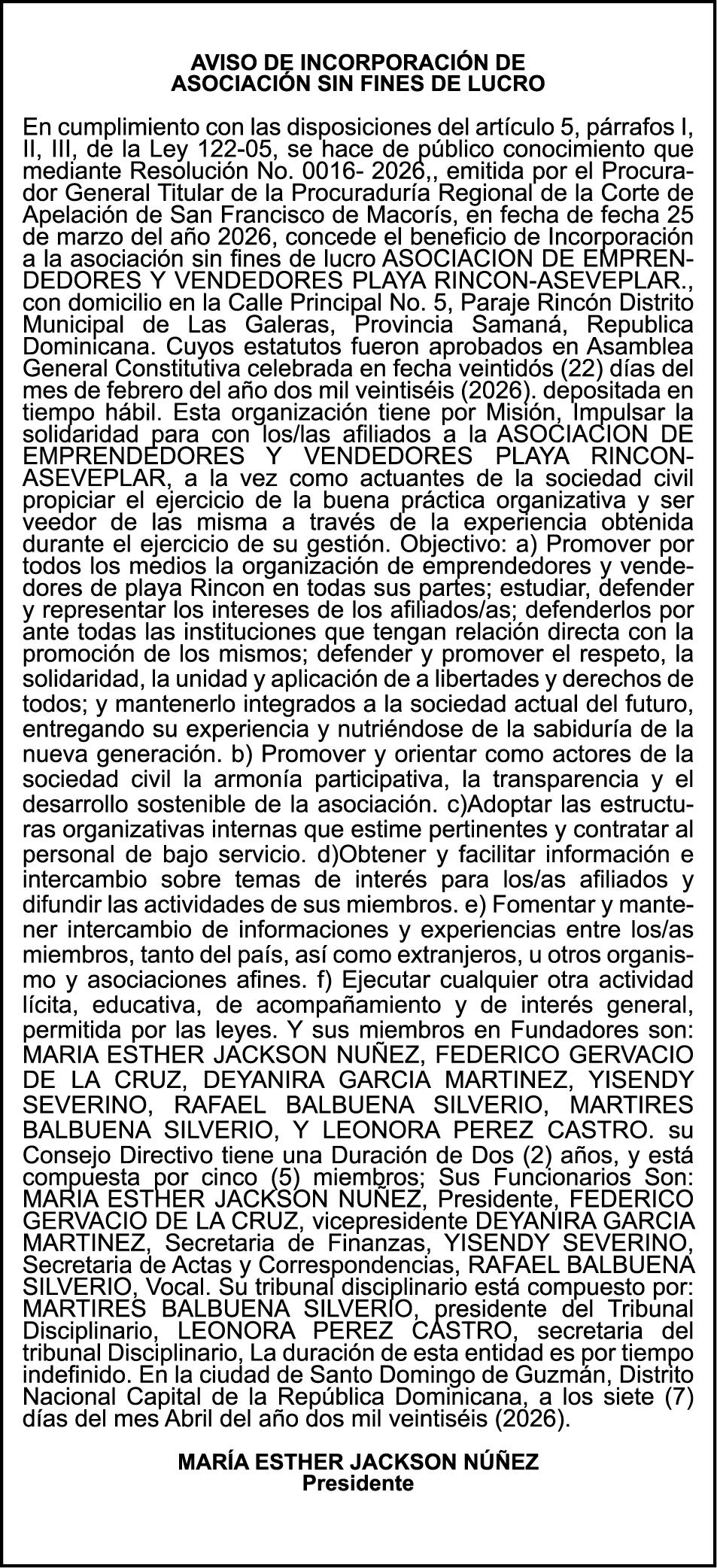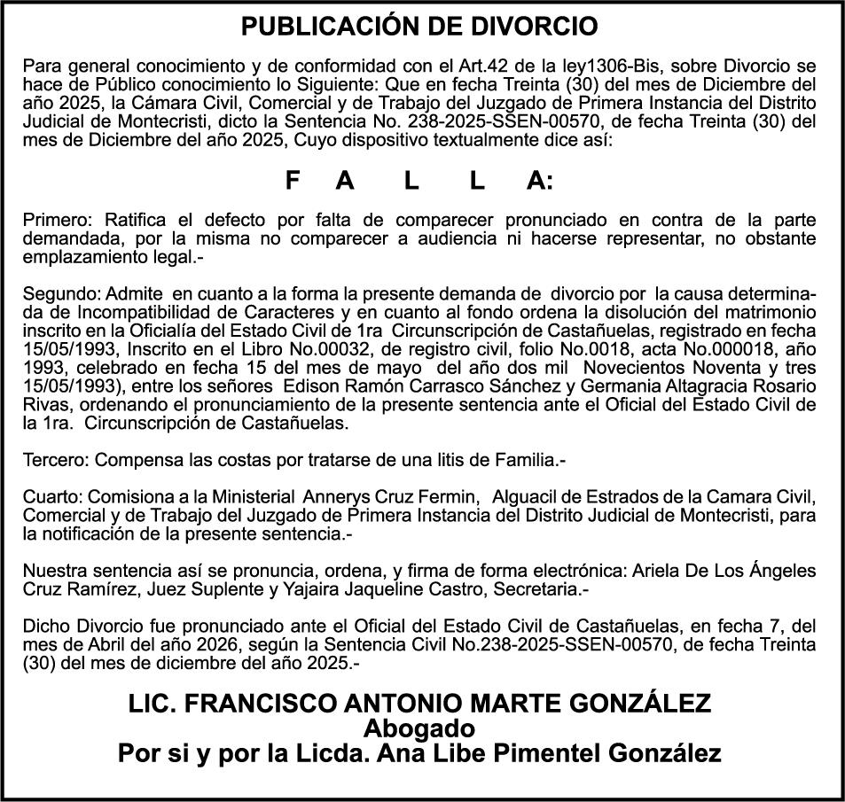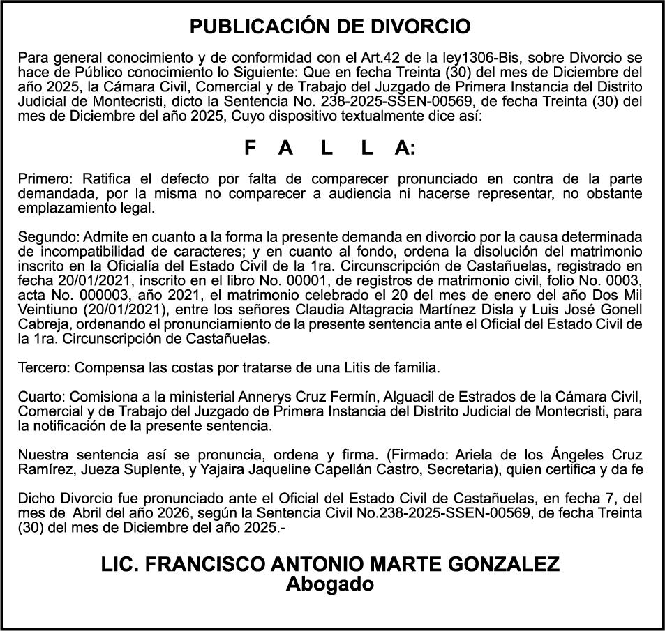 PERDIDA DE PLACA No. L329487, CARGA MITSUBISHI, color BLANCO, año 2006, chasis FE635EA48653, a nombre de ADVENTURE BOOGIES SRL AVISO TRASPASO DE EMBARCACION.EL señor MARIO MERCEDES, traspasa el bote de pesca de nombre;LUCIA-IV” matricula No. BP-L180-861SBS, de 19.0 pies de eslora, para que en lo adelante figure a nombre del señor RODOLFO FRANCO GUZMAN , como nuevo ropietario.