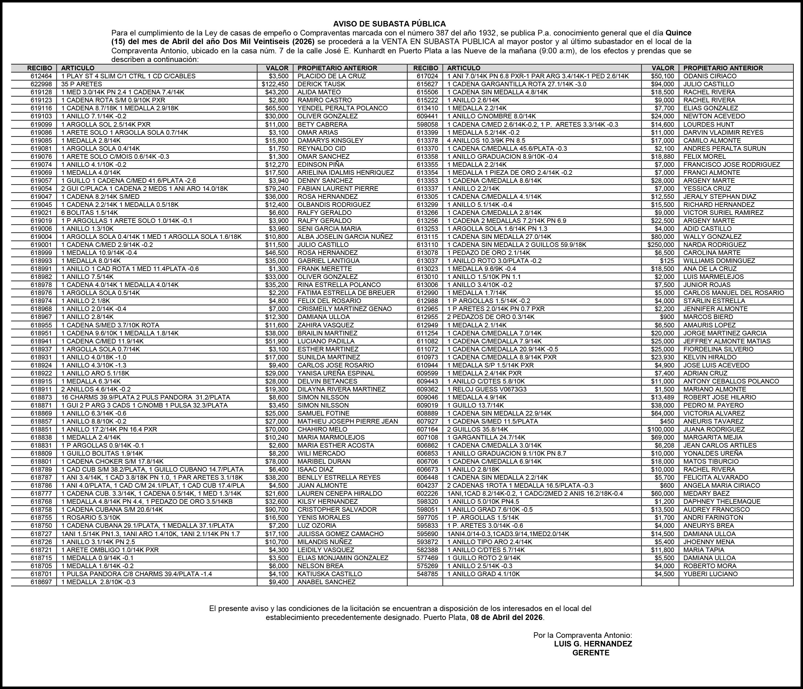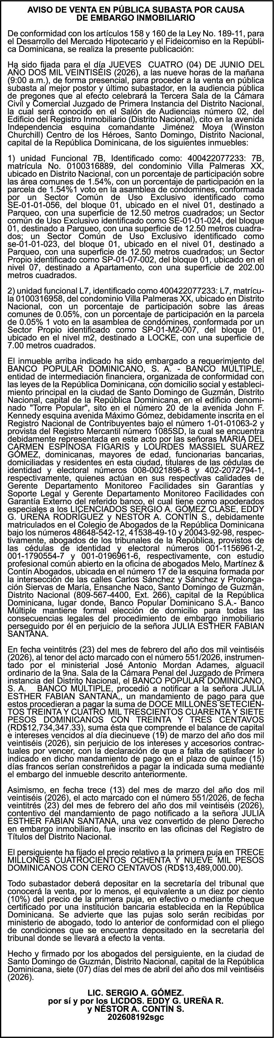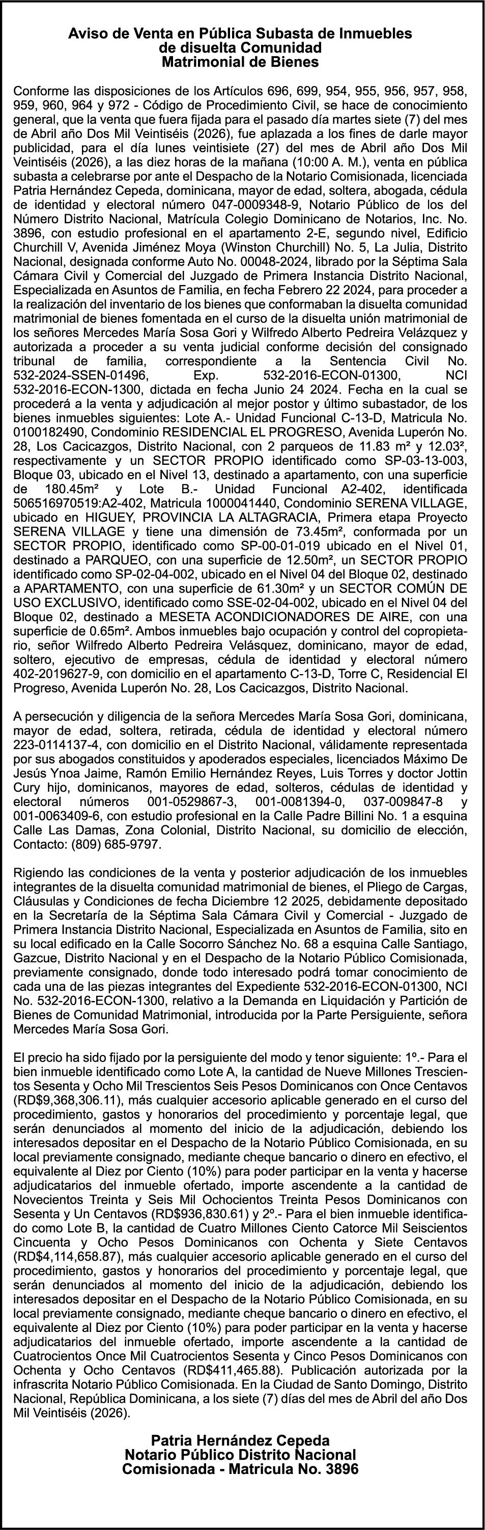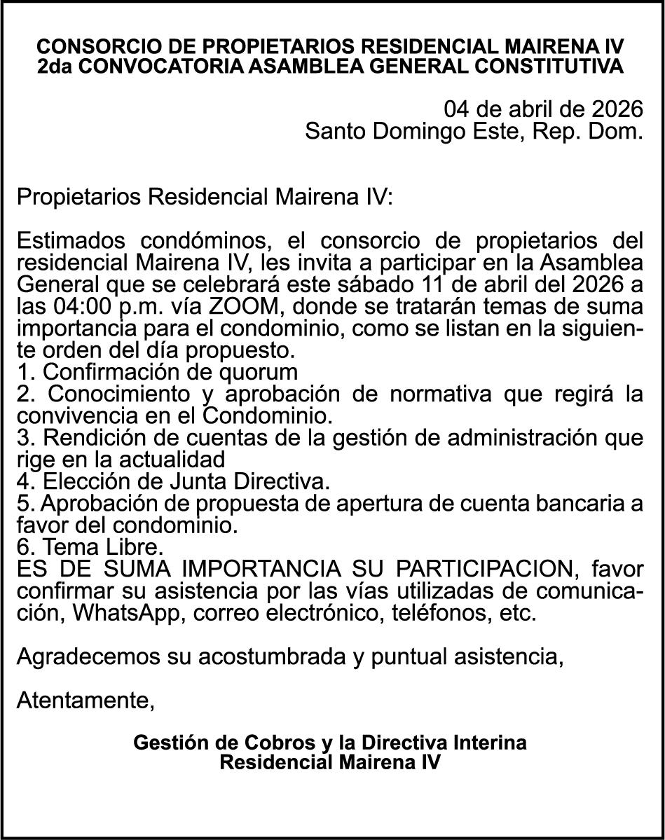 PERDIDA DE PLACA No. L329487, CARGA MITSUBISHI, color BLANCO, año 2006, chasis FE635EA48653, a nombre de ADVENTURE BOOGIES SRL AVISO TRASPASO DE EMBARCACION.EL señor MARIO MERCEDES, traspasa el bote de pesca de nombre;LUCIA-IV” matricula No. BP-L180-861SBS, de 19.0 pies de eslora, para que en lo adelante figure a nombre del señor RODOLFO FRANCO GUZMAN , como nuevo ropietario.