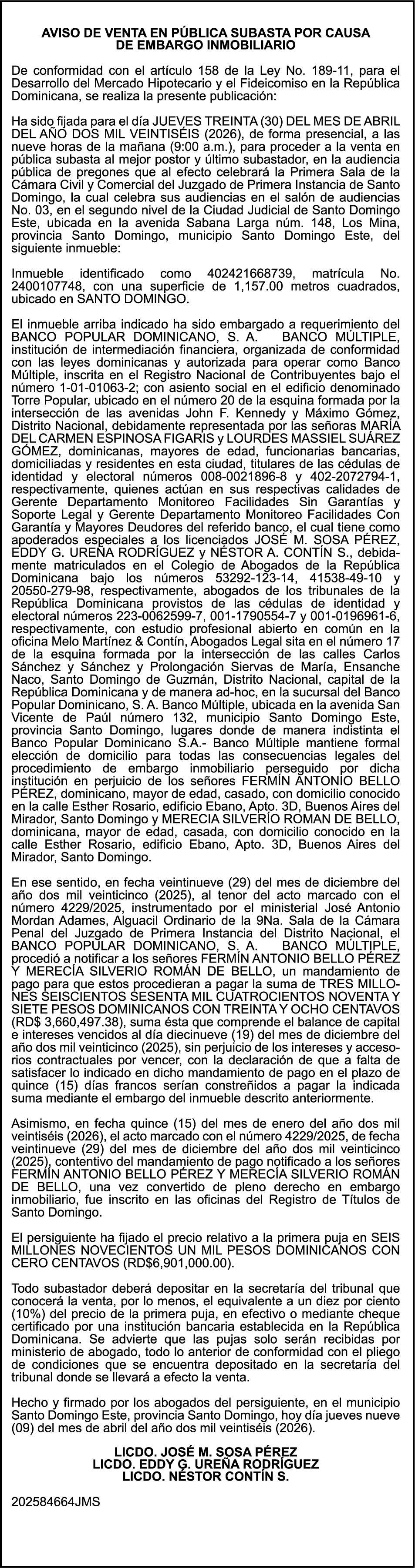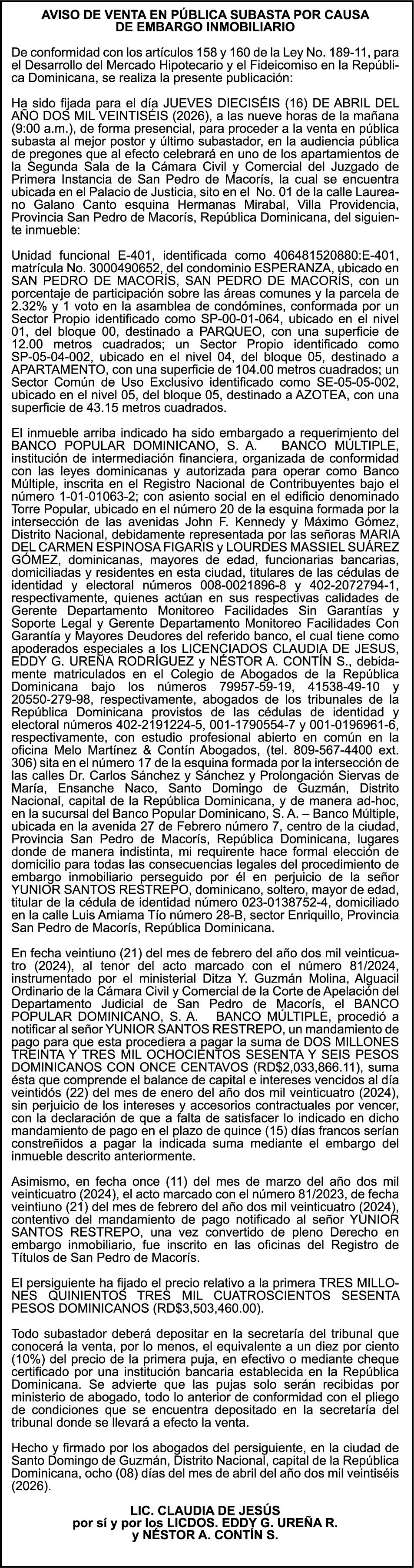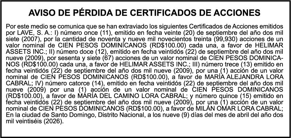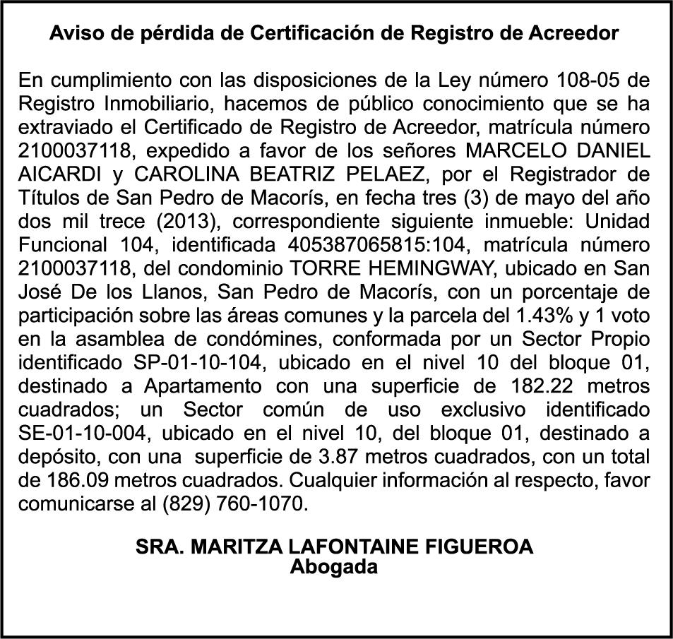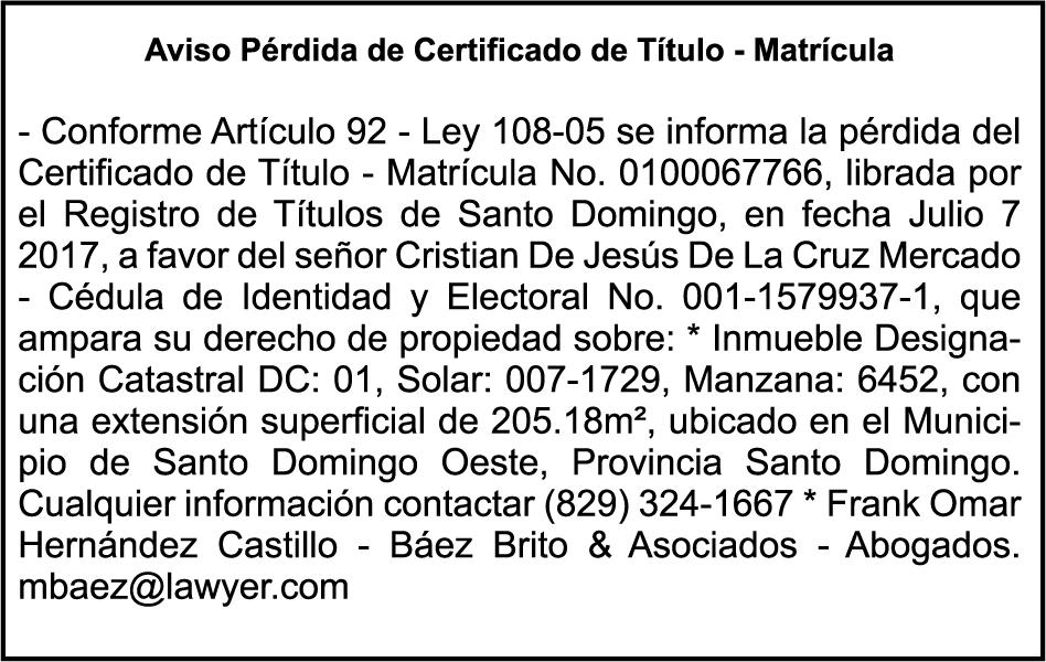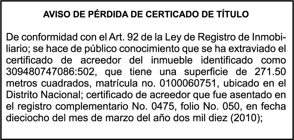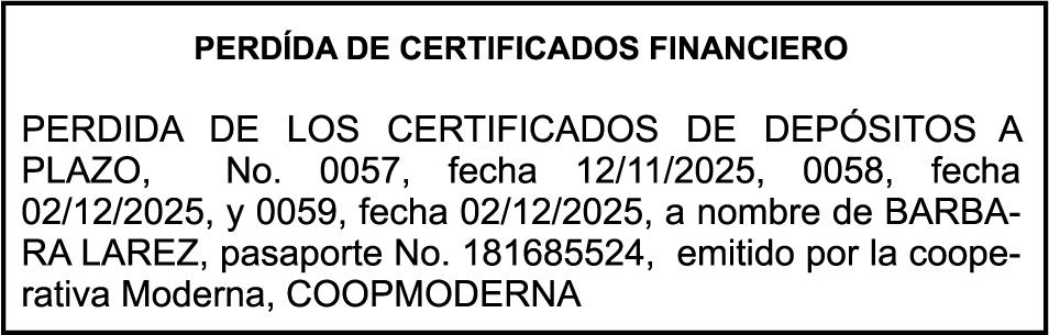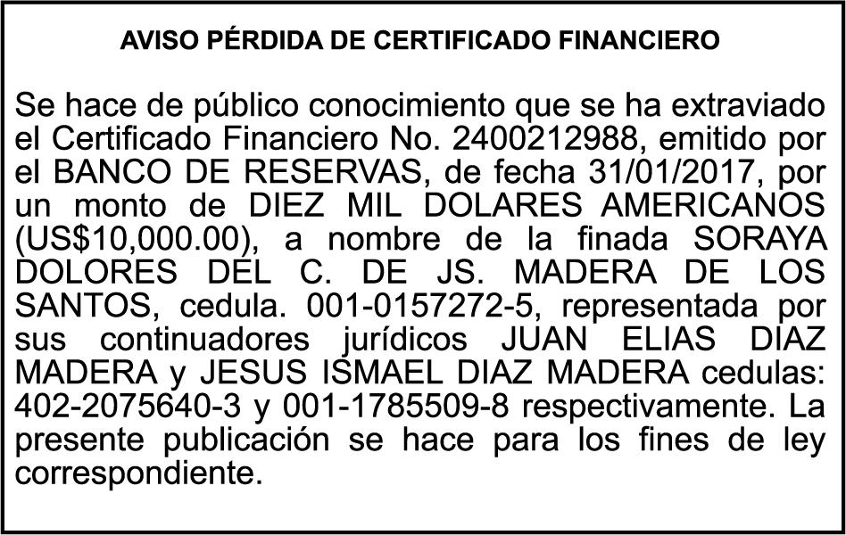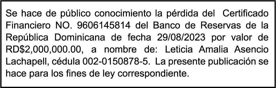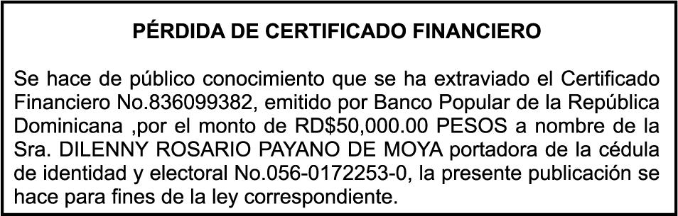 SE hace de público conocimiento la pérdida del Certificado Financiero número 795143270 emitido por Banco Popular Dominicano, S. A. Banco Múltiple, a nombre de BERTHA FLORES DE VALDEZ, portadora de la Cédula de Identidad y Electoral número 001-0352734-7 certificado número 795143270 expedido el 1 de febrero de 2016 por el monto de (RD$491,478.24) más intereses generados a la fecha.
