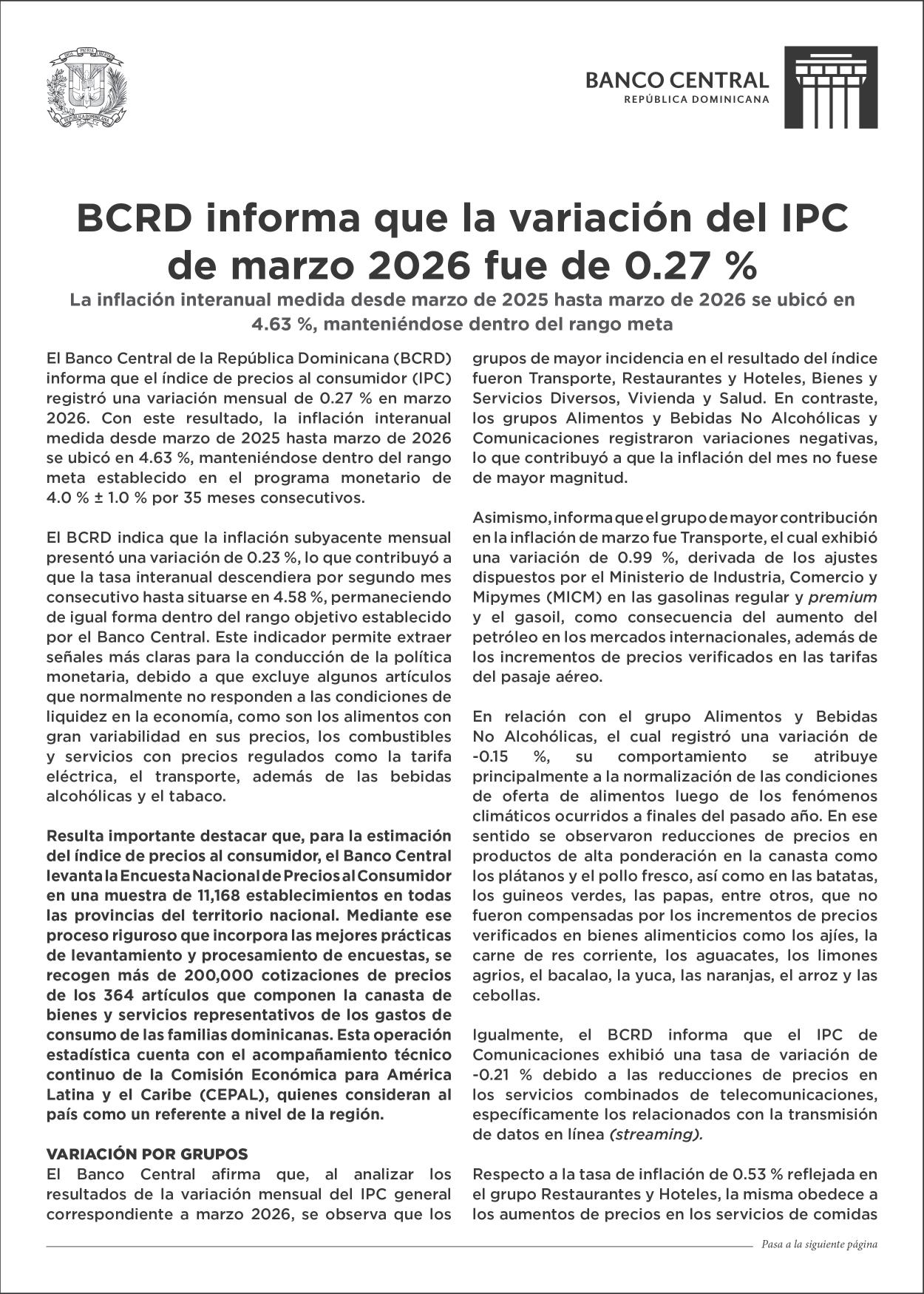 INFORME. Banco Central destaca se mantiene dentro del rango meta establecido en el programa monetario de 4.0 % +/- 1.0 % por 35 meses consecutivos. P.16
