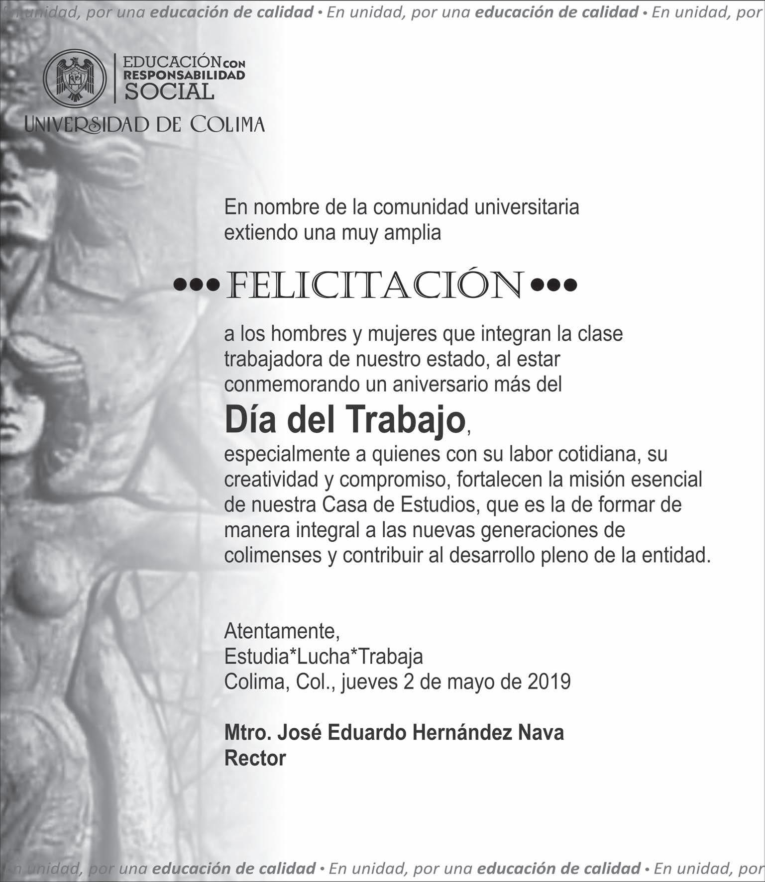En su turno, el gobernador José Ignacio Peralta Sánchez agradeció la participación de los universitarios en el desfile de los trabajadores, pues han demostrado año con año, dijo, “ser el contingente más numeroso y ordenado de dicho evento. Además, agradezco a José Eduardo Hernández Nava el respaldo que brinda al Gobierno del estado, pero más allá de eso, a la entidad federativa en general. Colima ha logrado mucho y esos logros históricos se han construido con el esfuerzo, la sabiduría y el conocimiento de los universitarios”.