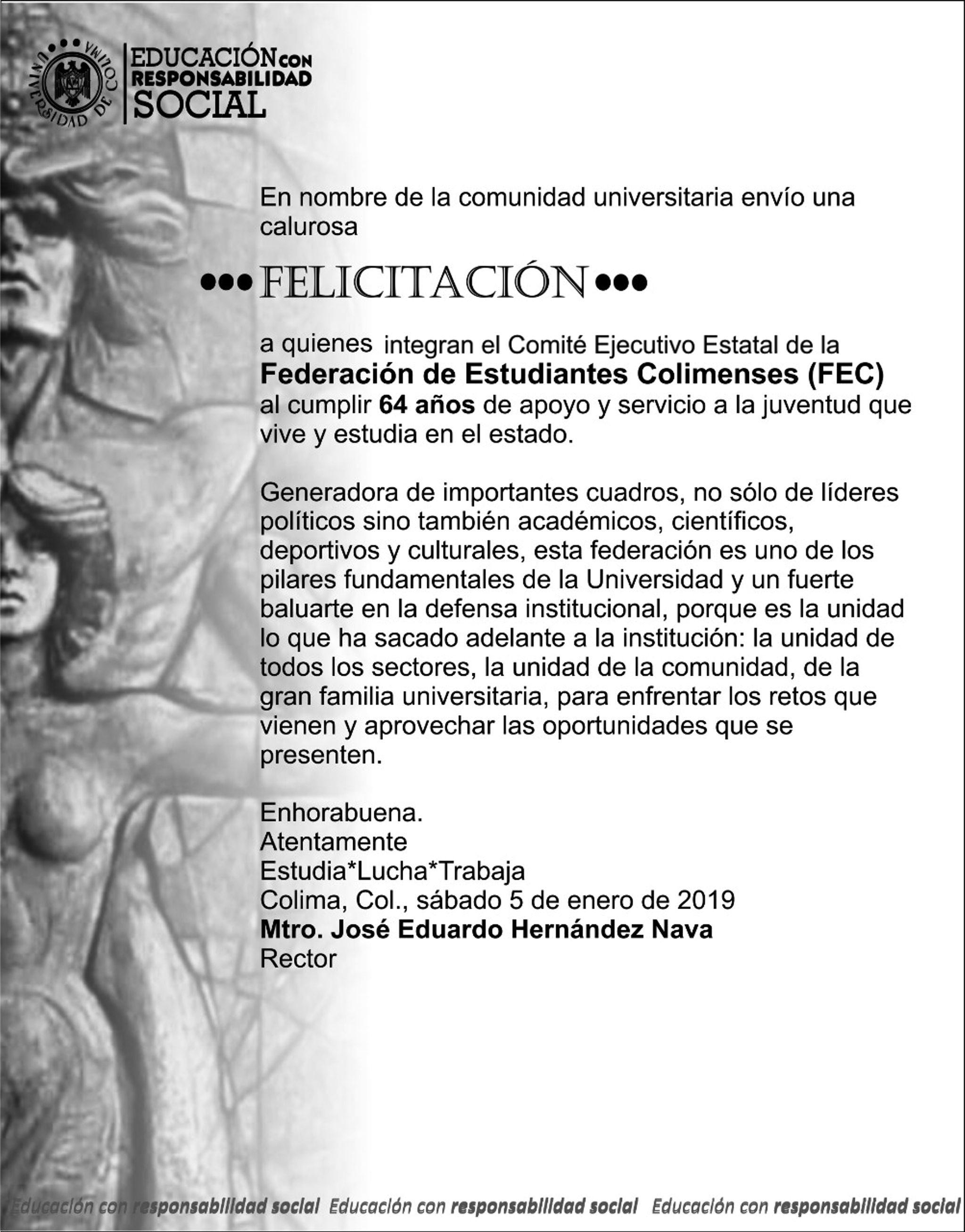 educación con responsabilidad social, con sus funciones sustantivas. Por encima de cualquier circunstancia y entorno, en la U de C existe la certeza de que es necesario seguir sumando en positivo para lograr que Colima y México avancen. También es necesario subrayar que en 2019, la Universidad de Colima se mantendrá firme, exigiendo respeto a su autonomía, procurando el libre intercambio de ideas y comprometiéndose con la libertad y el pluralismo, desde el ámbito de los valores académicos. En este nuevo ciclo, nada será diferente en ese sentido.