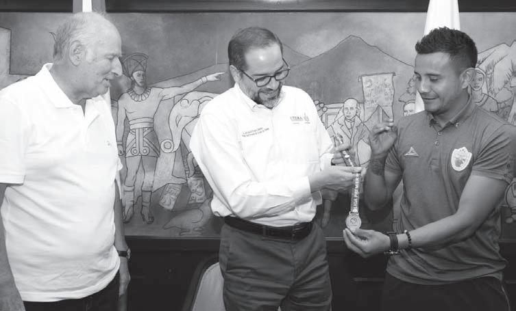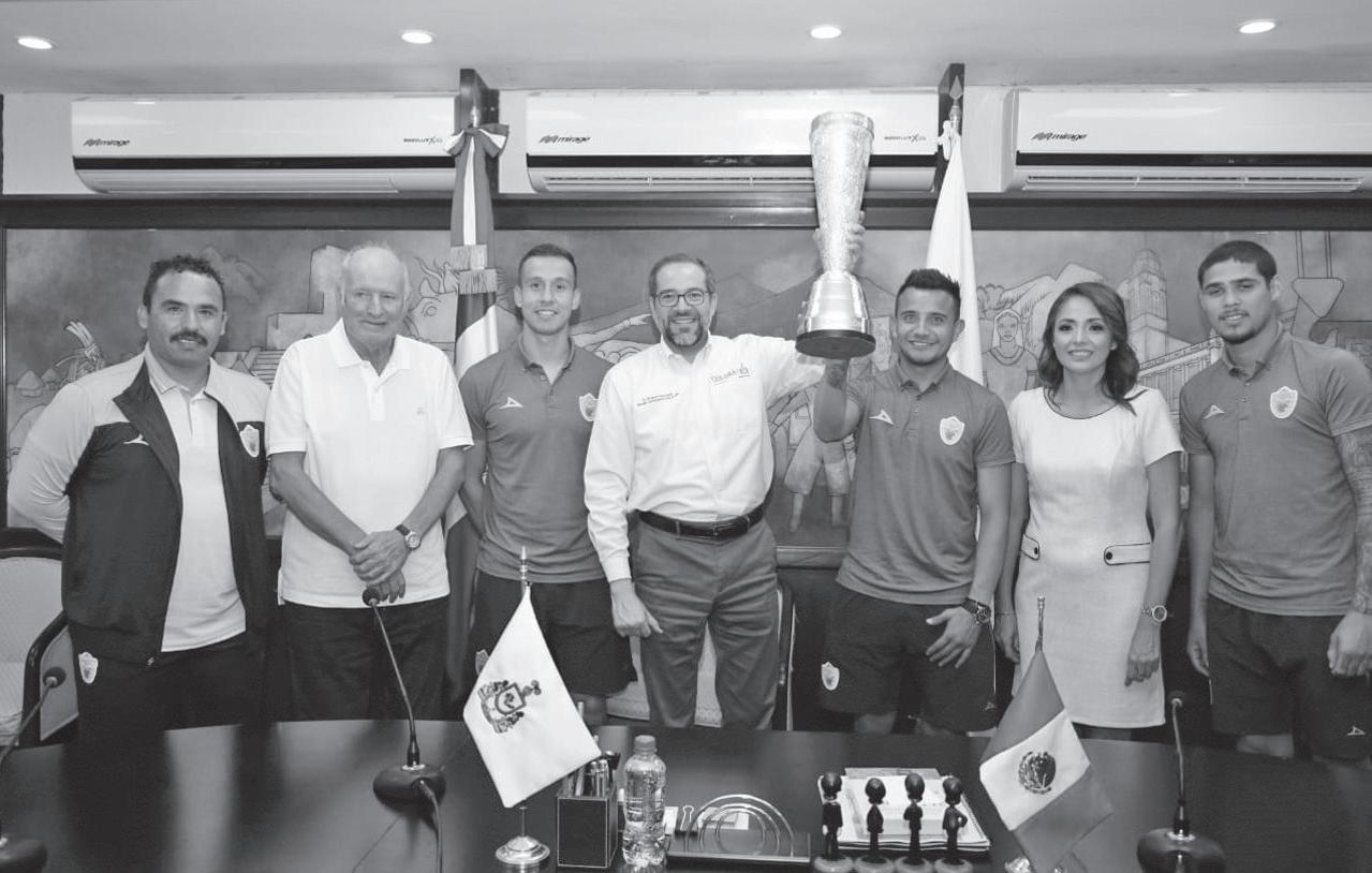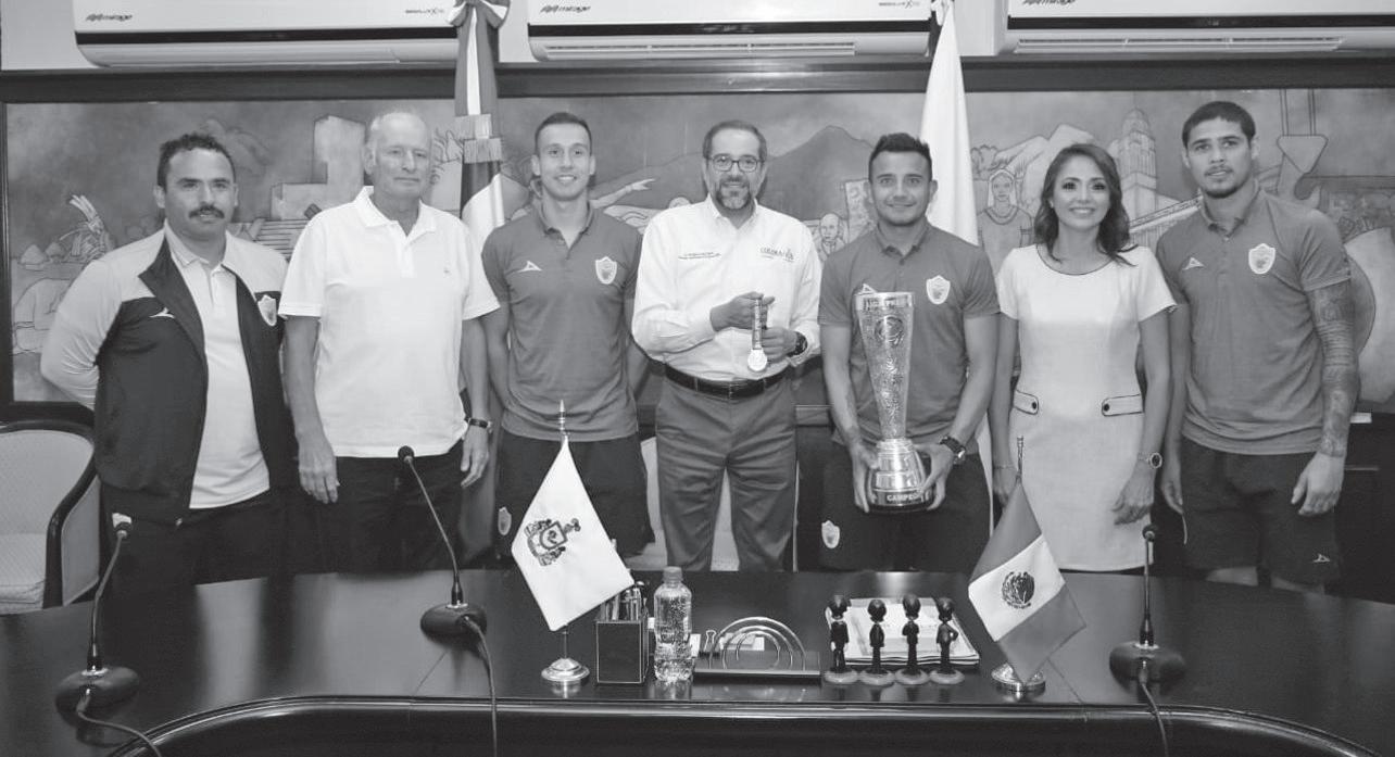 El gobernador José Ignacio Peralta Sánchez recibió a integrantes y dueño del equipo Loros de Colima, Jimmy Goldsmith, quienes luego de resultar campeones de la Liga Premier, presentaron al mandatario estatal la copa y le entregaron la medalla de campeones.