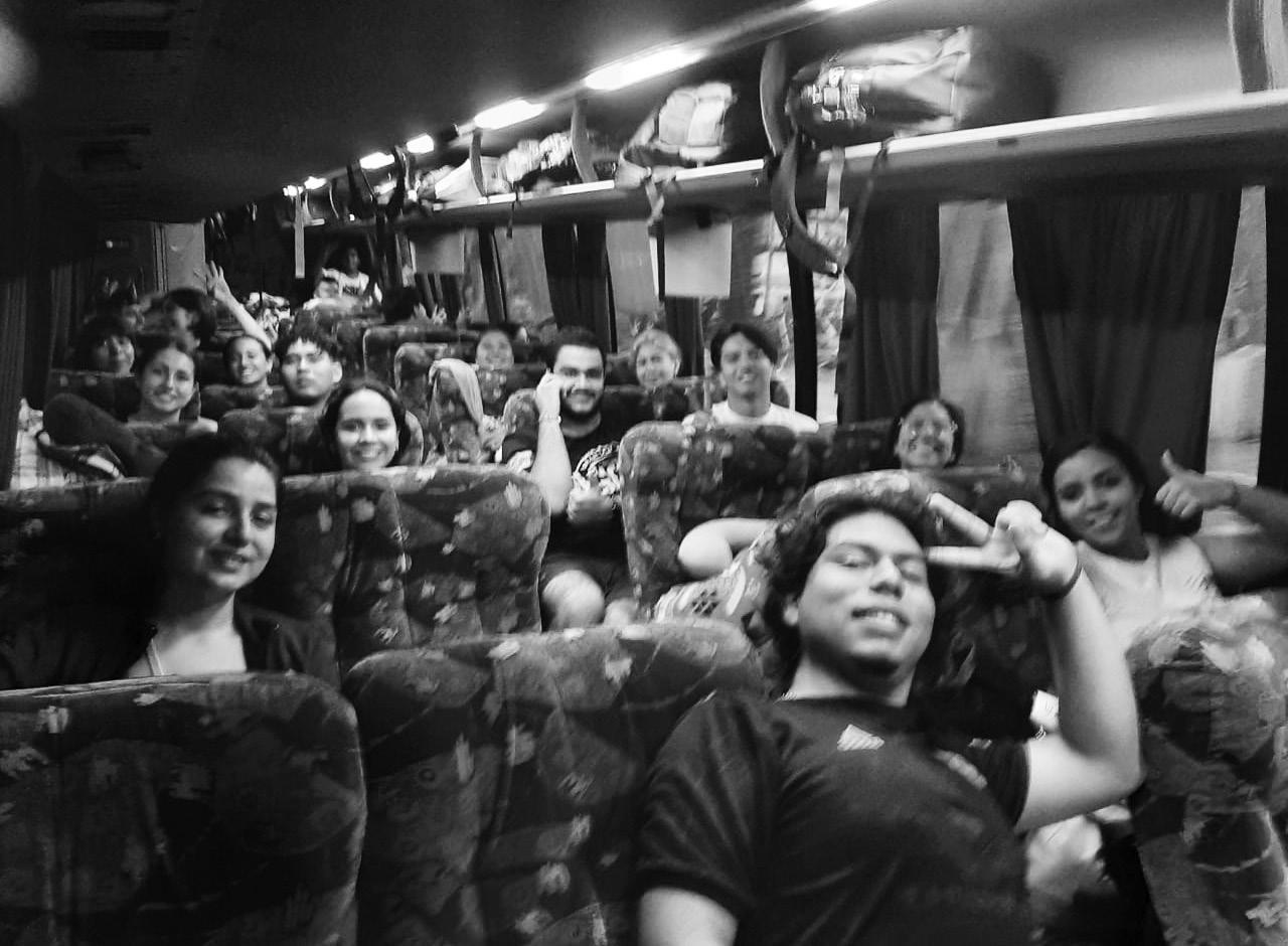 La travesía de regreso a Colima duró 22 horas, pues los caminos eran casi intransitables; se tuvo que rodear y llegar hasta la Ciudad de México y de ahí hacia Colima. El maestro Ibarra fotografió a las y los estudiantes en el camión. Se les ve cansados, pero sonrientes. Esta imagen luego la publicó el Rector Christian en sus redes.