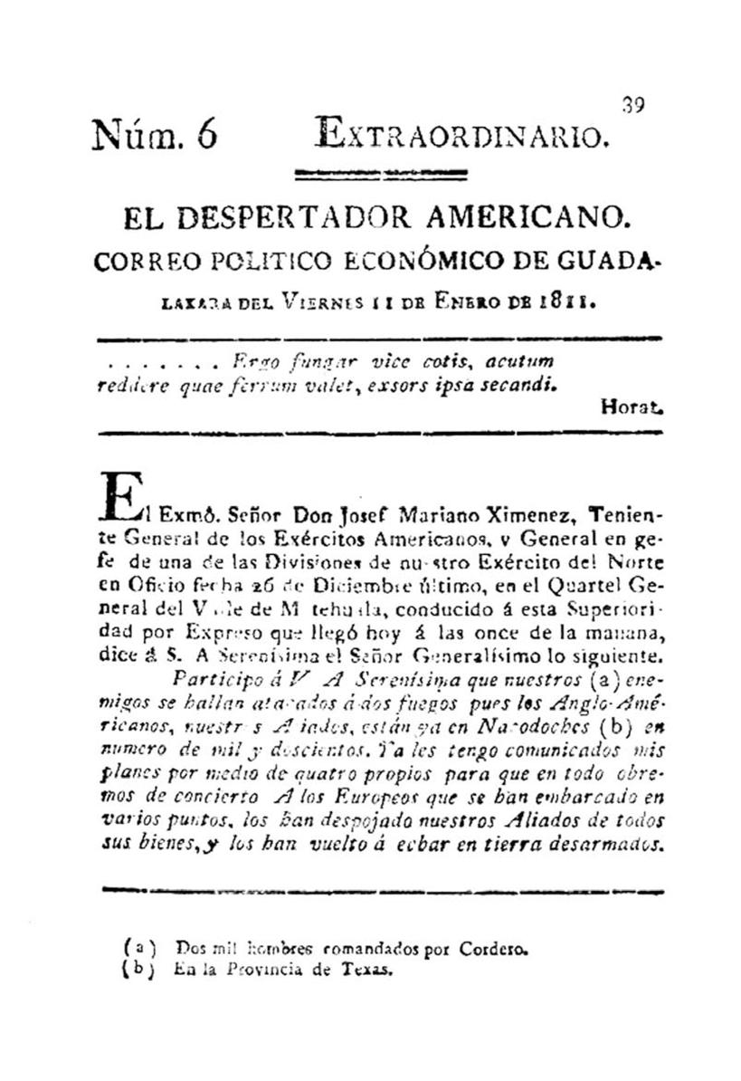 El Despertador Americano. Correo Político Económico de Guadalaxara. Desde ese momento germinó un medio impreso de vida breve pero de carácter explosivo, en el que las palabras de Miguel Hidalgo y Costilla provocaron chispas.