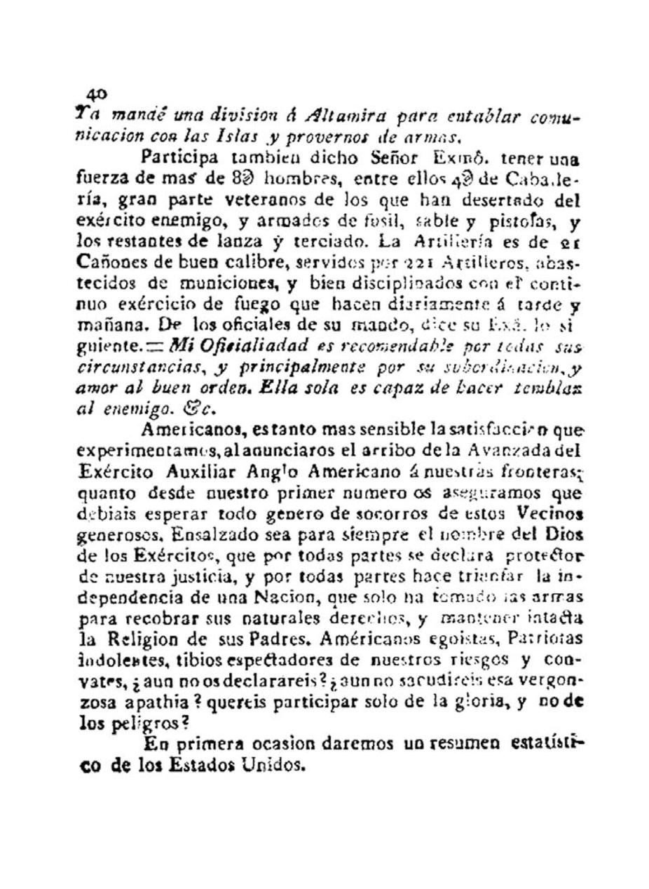 El primer número, en esta preciosa versión facsimilar, pone a nuestro alcance las palabras incendiarias: “[…] Nobles americanos! Virtuosos Criollos! Celebrados de quantos os conocen a fondo por la dulzura de vuestro carácter moral y por vuestra religiosidad acendrada! despertad al ruido de las cadenas que arrastrais ha tres siglos: abrid los ojos a vuestros verdaderos intereses, no os acobarden los sacrificios y privaciones que forzosamente acarrea toda revolución en un principio volad al campo del honor, cubrios de gloria […]”.