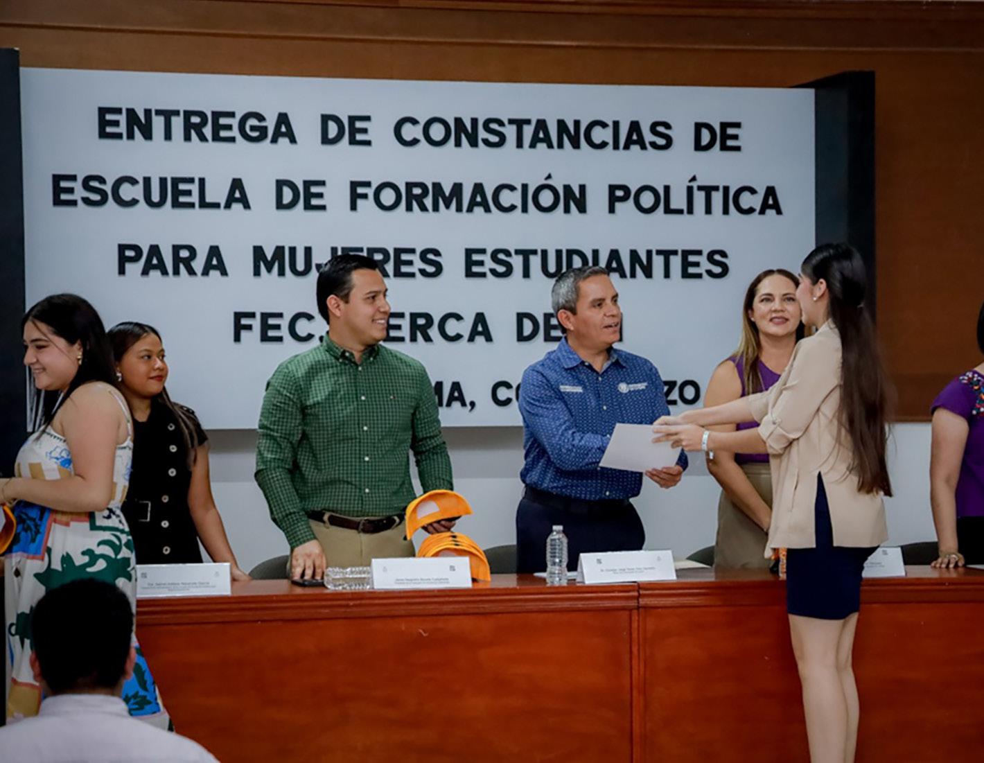 Christian Jorge Torres Ortiz Zermeño, Rector de la Universidad de Colima (UdeC), entregó las constancias que acreditan a las 40 mujeres estudiantes por su participación en la Escuela de Formación Política para Mujeres Estudiantes, la cual tiene como objetivo fortalecer el liderazgo, la participación y formación política de estudiantes de nivel medio superior y superior de la Máxima Casa de Estudios. El evento fue celebrado en el auditorio de la Federación de Estudiantes Colimenses (FEC).