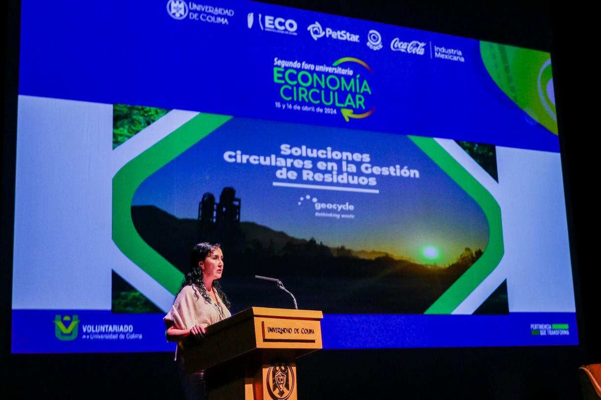 Marisela Contreras Gómez, coordinadora de operaciones en Geocycle México, planta Tecomán, impartió la charla “Soluciones circulares en la gestión de residuos”, como parte de las actividades del Segundo Foro Universitario de Economía Circular, realizado en la Universidad de Colima.