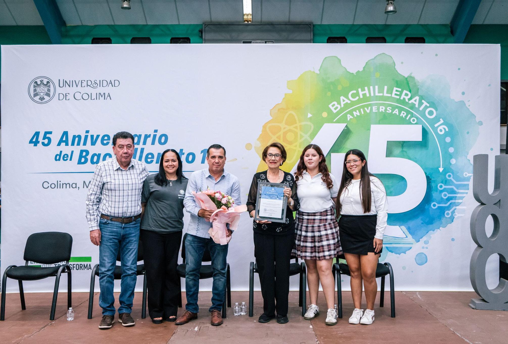 El Bachillerato 16 de la Universidad de Colima, Campus Villa de Álvarez, celebró su 45 Aniversario con una emotiva ceremonia en la que rindió homenaje a Ramona Carbajal Cárdenas, primera directora-fundadora del plantel, y reconoció la labor de los docentes y trabajadores con más de 25 años de servicio. También a egresados que ahora trabajan en esa escuela y quienes, por su antigüedad, han contribuido al fortalecimiento de esta institución educativa.