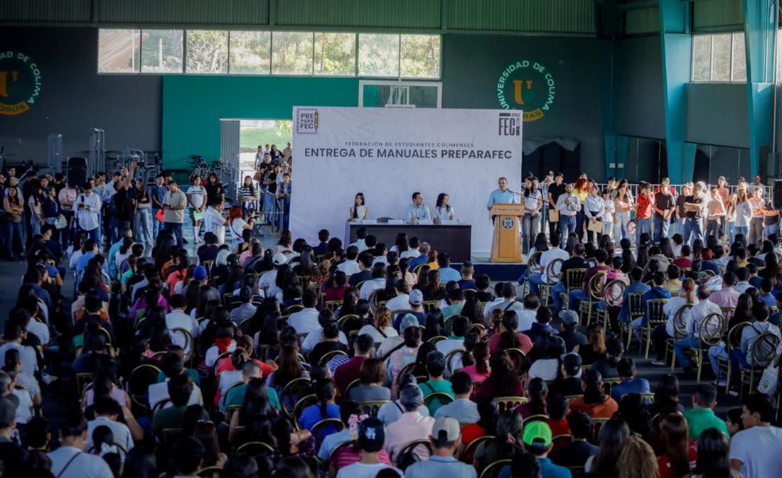 Con el propósito de mejorar la preparación académica de las y los jóvenes que presentarán su examen de ingreso a la Universidad de Colima (UdeC), tanto en licenciatura como en media superior, la Federación de Estudiantes Colimenses (FEC) entregó los manuales del curso-taller PreparaFEC 2026, en un evento realizado en el polideportivo central, que reunió a casi 3,500 personas, entre estudiantes, padres y madres de familia.