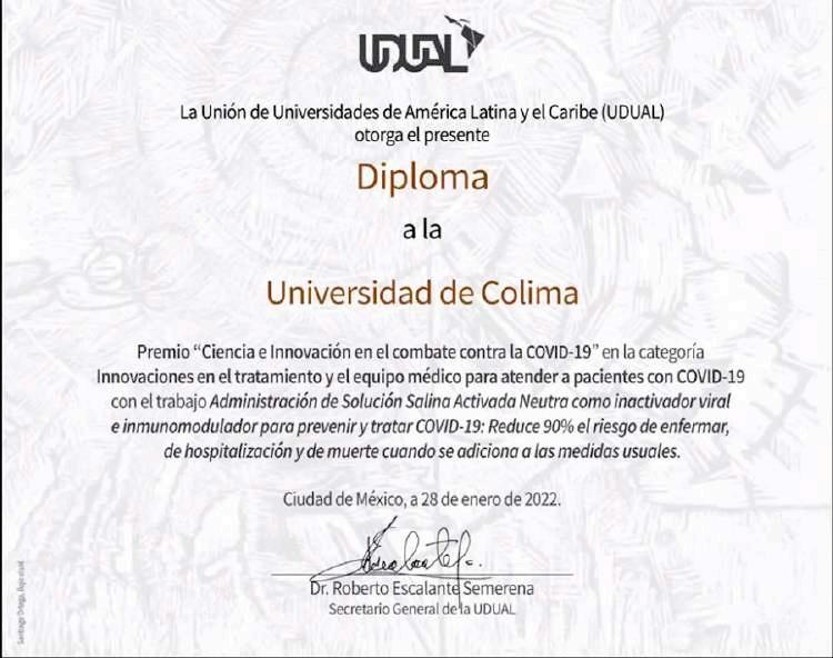 En ceremonia virtual, este miércoles (23) la Universidad de Colima recibió el Premio UdUal sobre “Ciencia e innovación en el combate contra el Covid-19”, en la categoría de “Innovaciones en el tratamiento y el equipo médico para atender a pacientes con Covid-19”, gracias al proyecto que encabezó el investigador de la Facultad de Medicina, Iván Delgado Enciso, y que consiste en la administración de una solución salina activada neutra, adicional a los protocolos usuales, para regular la inflamación y estimular el sistema inmune.