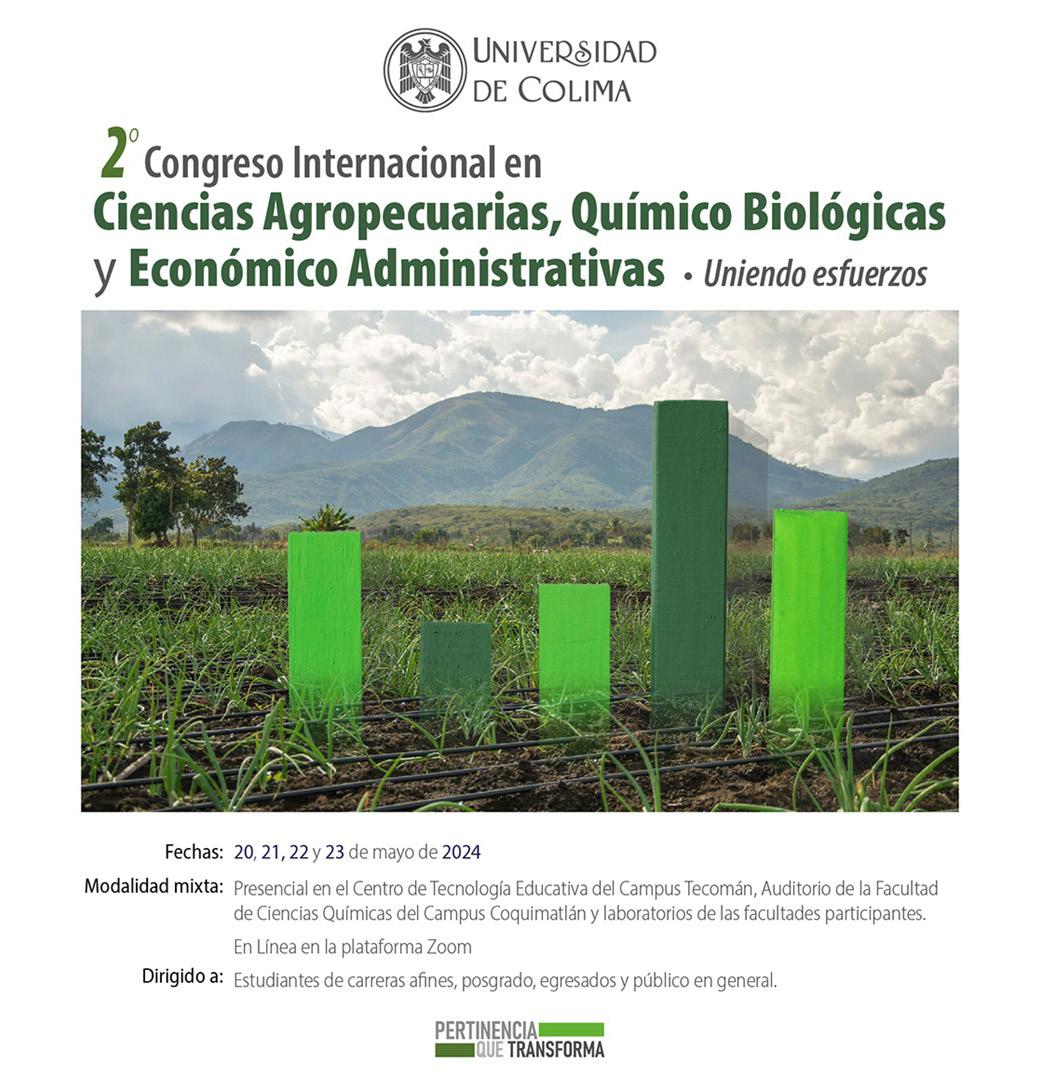 Del 20 al 23 de mayo, el Campus Tecomán de la Universidad de Colima será sede del “Segundo Congreso Internacional en Ciencias Agropecuarias, Químico Biológicas y Económico Administrativas”, un evento organizado de manera conjunta por las facultades de Contabilidad y Administración, Ciencias Biológicas y Agropecuarias, Medicina Veterinaria y Zootecnia y Ciencias Químicas.