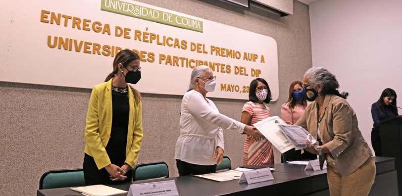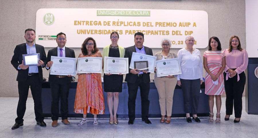 SerealizólaentregadeRéplicasdel Premio de la Asociación Universitaria Iberoamericana de Postgrado (AUIP) a las y los representantes institucionales de las cinco sedes participantes del Doctorado Interinstitucional en Psicología(DIP),enuneventoquetuvo lugar en el auditorio de la Facultad de PsicologíadelaUniversidaddeColima. Surgidohace14añoscomoparte delasreunionesdetrabajodelComité de Posgrados Interinstitucionales de lasUniversidadesPúblicasdelaRegión CentroOccidentede ANUIES,el DIP está integrado por las universidades de Colima,AutónomadeAguascalientes, de Guadalajara, de Guanajuato y la Michoacana de San Nicolás de Hidalgo y tiene como fin promover la formación de investigadores y docentes de alto nivel que mejoren la calidad académica de los programas de licenciatura y maestría que se ofrecen en la región, así como impulsar la generación y transmisión delconocimiento.